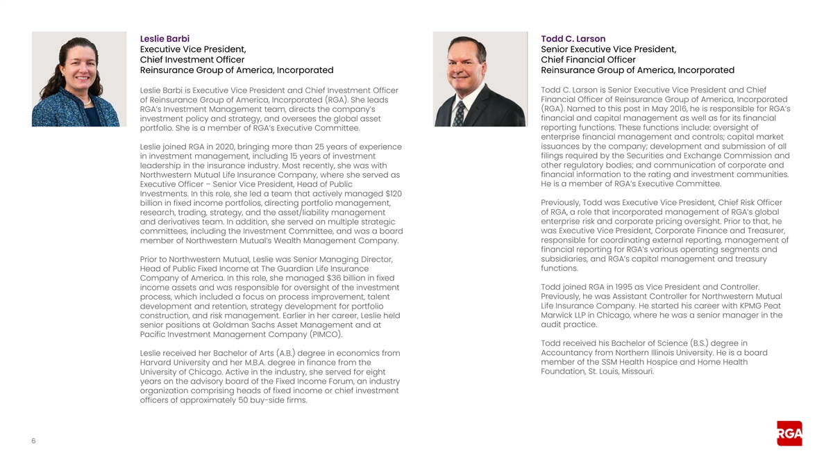 Leslie BarbiTodd C. Larson执行副总裁、高级执行副总裁兼首席投资官美国再保险集团,Incorporated丨Reinsurance Group of America 美国再保险集团,Incorporated丨Leslie Barbi Leslie Barbi为执行副总裁兼首席投资官TERM6为高级执行副总裁兼美国再保险集团,Incorporated TERM7,Incorporated RGA。她领导美国再保险集团集团有限公司(Incorporated)(RGA)的财务官。2016年5月被任命为该职位,负责RGA的RGA投资管理团队,指导公司的财务和资本管理以及金融投资政策和战略,并监督全球资产报告职能。这些职能包括:监督投资组合。她是RGA执行委员会成员。企业财务管控;资本市场Leslie于2020年加入RGA,带来公司超过25年的发行经验;开发和提交证券交易委员会和投资管理方面要求的所有备案,包括15年的投资其他监管机构;以及保险行业企业和领导层的沟通。最近,她向评级和投资界提供财务信息。西北互助人寿保险公司,她曾担任该公司的执行官——高级副总裁、公共部门负责人他是RGA执行委员会的成员。投资。在这个职位上,她领导了一个主动管理120美元的团队。此前,Todd是RGA的执行副总裁、首席风险官十亿固定收益投资组合,指导投资组合管理,这个角色包括管理RGA的全球研究、交易、策略,以及资产/负债管理企业风险和企业定价监督。在此之前,他和衍生品团队。此外,她还曾在包括投资委员会在内的多个战略委员会任职,曾任董事会执行副总裁、企业财务和财务主管、Northwestern Mutual财富管理公司成员。负责协调外部报告,管理RGA各经营分部和子公司的财务报告,以及RGA的资本管理和财务。在加入Northwestern Mutual之前,Leslie是高级董事总经理,职能。美国嘉德人寿保险公司公共固定收益部门主管。在担任这一职务期间,她管理着360亿美元的固定收益资产,并负责监督投资。托德于1995年加入RGA,担任副总裁兼财务总监。此前,他是西北互助流程助理总监,其中包括一家专注于流程改进的人才人寿保险公司。他的职业生涯始于毕马威Peat开发和保留,芝加哥投资组合Marwick LLP的战略开发,在那里他担任建筑高级经理,以及风险管理。在其职业生涯的早期,Leslie曾在高盛资产管理公司和审计行业担任高级职务。太平洋投资管理公司(PIMCO)。托德在北伊利诺伊大学获得会计学理学学士(B.S.)学位。他是董事会成员Leslie获得了SSM Health Hospice和Home Health哈佛大学成员的经济学文学学士(A.B.)学位和芝加哥大学的金融学MBA学位。她活跃于该行业,曾在密苏里州圣路易斯的八基金会任职多年,担任固定收益论坛顾问委员会成员,该论坛是一个行业组织,由大约50家买方公司的固定收益主管或首席投资官组成。6