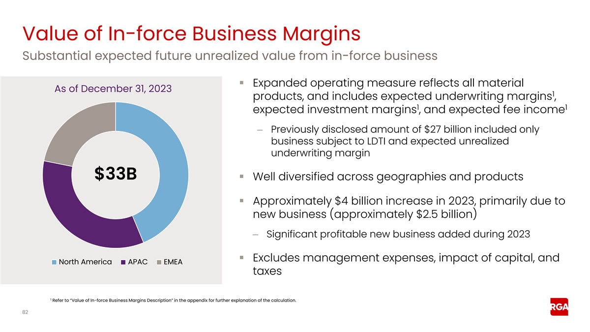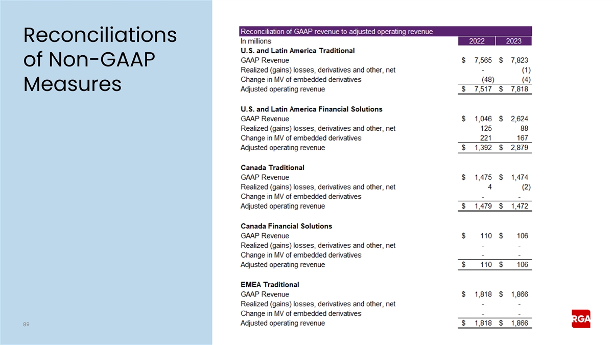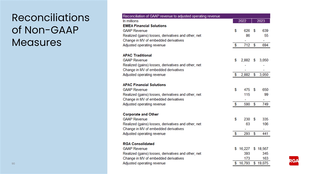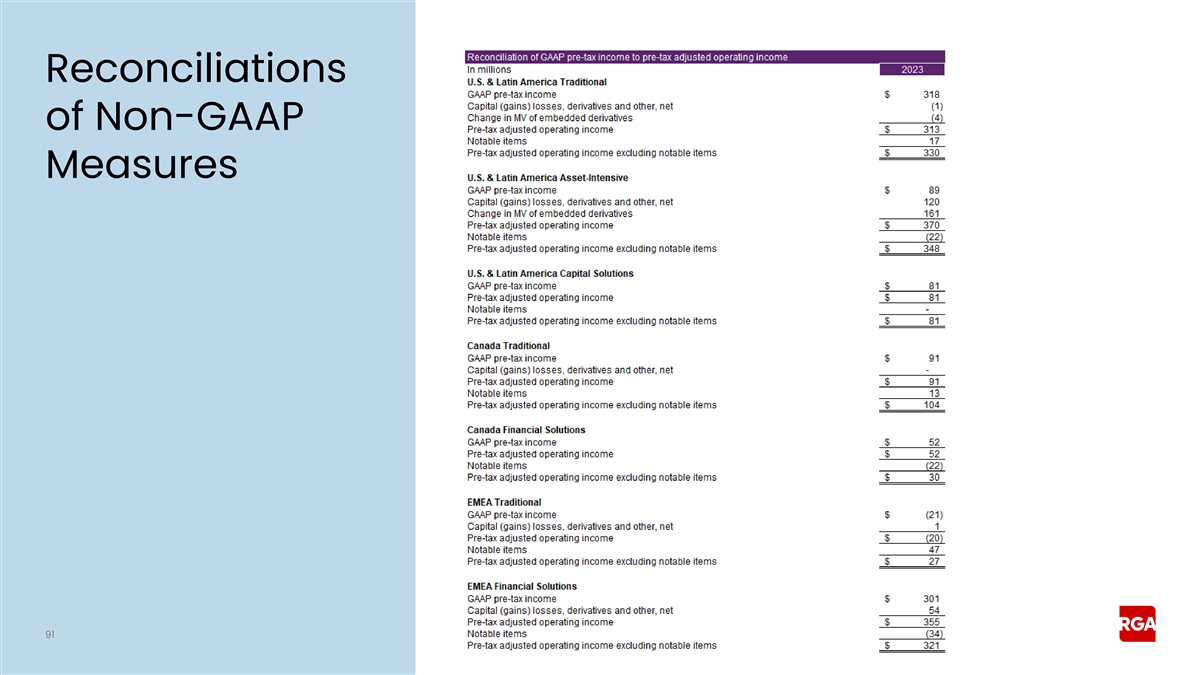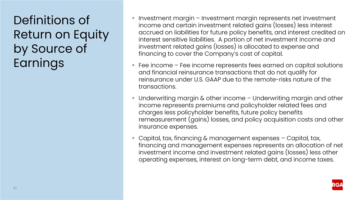 ▪投资保证金–投资保证金指净投资定义的收入和某些与投资相关的收益(损失)减去为未来保单利益而应计负债的利息,以及计入股权利息敏感负债的利息回报的利息。净投资收益和投资相关收益(损失)的一部分被分配到费用和按来源融资,以支付公司的资本成本。收益▪费用收入–费用收入指由于交易的远程风险性质,在美国公认会计原则下不符合再保险条件的资本解决方案和财务再保险交易中赚取的费用。▪承保保证金和其他收入–承保保证金和其他收入指保费和投保人相关费用和收费减去投保人利益、未来保单利益重新计量(收益)损失以及保单购置成本和其他保险费用。▪资本、税收、融资和管理费用–资本、税收、融资和管理费用是指净投资收益和投资相关收益(损失)减去其他运营费用、长期债务利息和所得税的分配。87