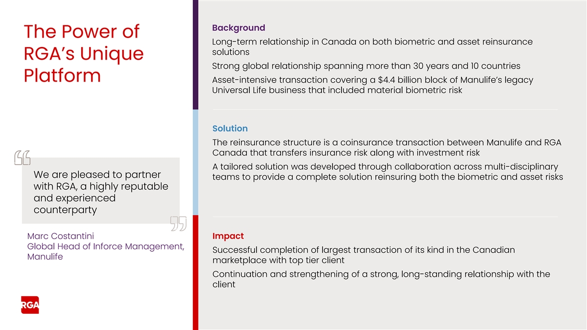 背景加拿大长期合作关系在生物识别和资产再保险解决方案上的力量RGA独特的跨越30多年、遍布10个国家的强大全球关系平台资产密集型交易涵盖宏利传统的万能寿险业务中价值44亿美元的一块,其中包括重要的生物识别风险解决方案。再保险结构是宏利与RGA加拿大之间的一种共保交易,将保险风险与投资风险一起转移。通过跨多学科的协作开发了量身定制的解决方案,我们很高兴与合作团队提供完整的解决方案,以保证生物识别和资产风险与RGA,信誉卓著且经验丰富的交易对手Marc Costantini Impact Inforce Management全球主管,成功完成加拿大宏利市场同类最大交易,顶级客户延续并加强与客户的长期牢固关系