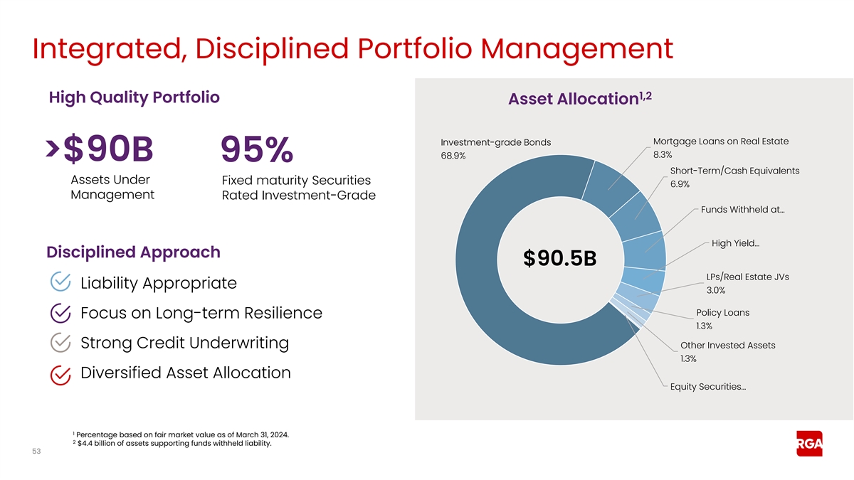 一体化、有纪律的投资组合管理1,2房地产投资级债券的优质投资组合资产配置抵押贷款8.3% 68.9% > $ 90B 95%固定期限证券下的短期/现金等价物资产6.9%管理评级的投资级基金扣留在…高收益…有纪律的方法$ 90.5B LP/房地产合资企业负债适当3.0%政策性贷款侧重长期韧性1.3%强信用承销其他投资资产1.3%多元化资产配置权益证券…1个百分比基于截至2024年3月31日的公允市场价值。24.4亿美元资产支持基金被扣留负债。53