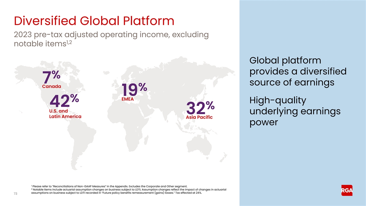 多元化全球平台2023年税前调整后营业收入,不包括1,2个值得注意的项目全球平台提供多元化的% 7收益来源加拿大% 19 EMEA %高质量42%美国和32基础收益拉丁美洲亚太电力1请参阅附录中的“非GAAP措施的调节”。不包括企业和其他部门。2值得注意的项目包括受LDTI约束的业务的精算假设变化;假设变化反映了“未来保单利益重新计量(收益)损失”中记录的受LDTI约束的业务的精算假设变化的影响。税率为24%。73