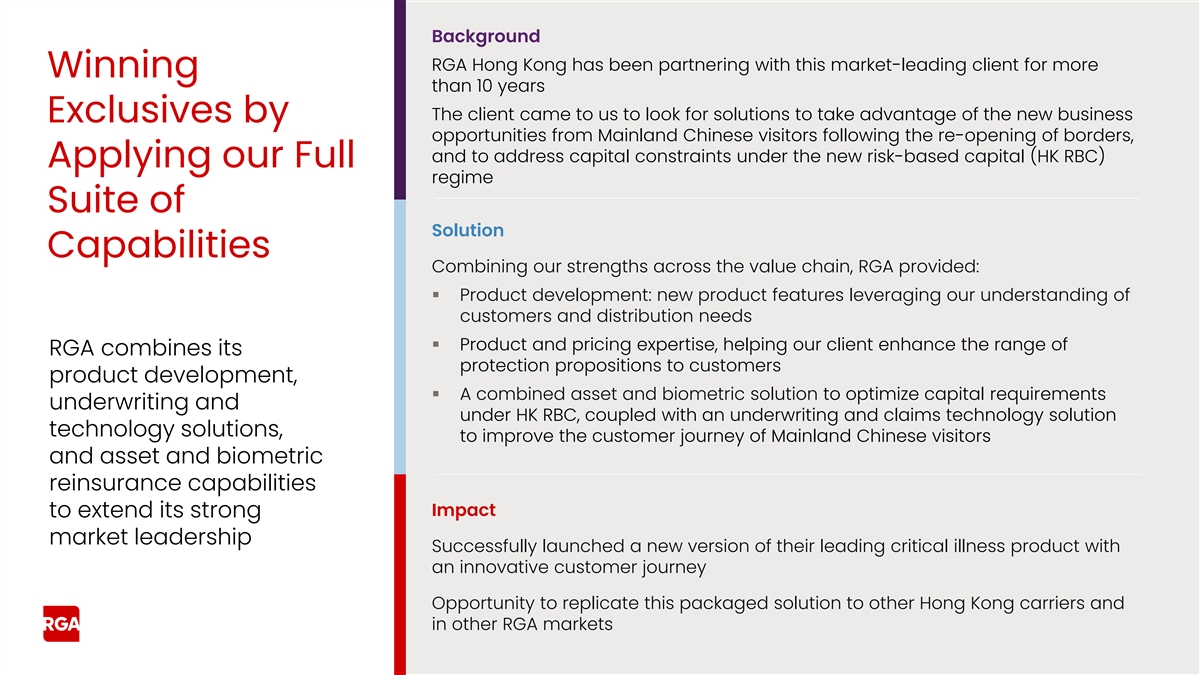 背景RGA香港已与这个市场领先的客户合作超过10年赢得该客户来我们这里寻找解决方案,以利用边境重新开放后中国大陆访客的机会利用新业务Exclusives,并在新的风险基础资本(香港RBC)下解决资本限制问题,应用我们的全制度解决方案能力套件,结合我们在整个价值链中的优势,RGA提供:▪产品开发:利用我们对客户和分销需求的理解的新产品功能▪产品和定价专业知识,帮助我们的客户提高RGA的范围结合其对客户的保护主张产品开发,▪一个组合的资产和生物识别解决方案,以优化资本要求承保和在HK RBC下,再加上承保和理赔技术解决方案技术解决方案,以改善中国大陆访客的客户旅程以及资产和生物识别再保险能力Impact以延伸其强大的市场领导地位成功推出了其领先的重疾产品的新版本,具有创新的客户旅程机会,可将这一打包解决方案复制到其他香港运营商和其他RGA市场