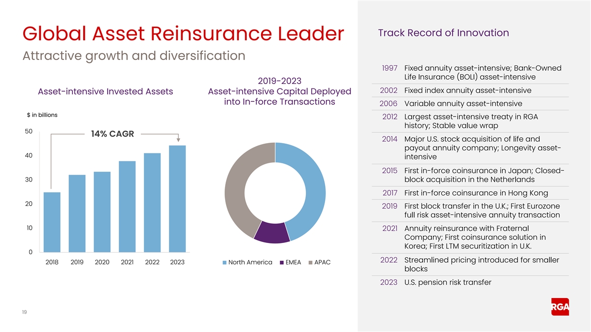 创新往绩全球资产再保险龙头诱人增长与多元化1997年固定年金资产密集型;银行系人寿保险(BOLI)资产密集型2019-2023年2002年固定指数年金资产密集型资产密集型投资资产资产密集型资本部署成有效交易2006年可变年金资产密集型数十亿美元2012年RGA历史上最大的资产密集型条约;稳定价值包装5014% CAGR2014年美股重大收购生命和支付年金公司;长寿资产-40密集2015年日本首个有效的共同保险;已完成-荷兰30块收购2017年香港首个有效的共同保险202019年英国首个大宗转让;首个欧元区全风险资产密集年金交易102021年与兄弟公司的年金再保险;韩国首个共同保险解决方案;英国首个LTM证券化02022为较小的2018年引入的简化定价20192020202120222023北美EMEA亚太地区区块2023美国养老金风险转移19