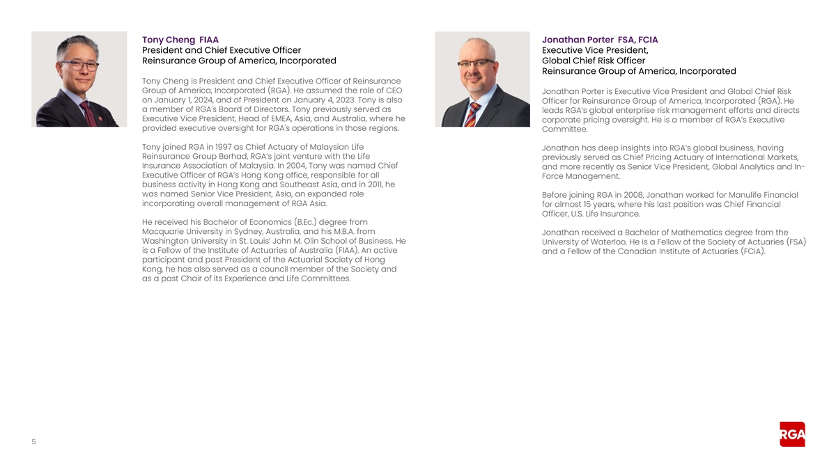 Tony Cheng FIAA 美国再保险集团,Incorporated 美国再保险集团,FCIA总裁兼首席执行官Jonathan Porter FSA,FCIA总裁兼美国再保险集团执行副总裁,Incorporated全球首席风险官TERM3,Incorporated Tony Cheng is President and Chief Executive Officer of TERM5,Incorporated(RGA)。履新CEO Jonathan Porter于2024年1月1日担任执行副总裁兼全球首席风险,于2023年1月4日担任总裁。Tony还是美国再保险集团集团有限公司(RGA)的高级职员。他是RGA董事会成员。Tony此前曾担任RGA全球企业风险管理工作的负责人,并指导执行副总裁兼欧洲、中东和非洲、亚洲和澳大利亚负责人,负责公司定价监督。他是RGA的一名成员,该高管为RGA在这些地区的业务提供了行政监督。委员会。Tony于1997年加入RGA,担任马来西亚人寿首席精算师Jonathan对RGA的全球业务有着深刻的见解,拥有Reinsurance Group Berhad,RGA与人寿的合资企业此前曾担任马来西亚保险协会国际市场首席定价精算师。2004年,Tony被任命为Chief,最近担任Global Analytics高级副总裁和RGA香港办事处的In-Executive Officer,负责All Force Management.在香港和东南亚的业务活动,并在2011年被任命为亚洲高级副总裁,这是一个扩大的角色。在2008年加入RGA之前,Jonathan曾在RGA亚洲的整体管理机构宏利金融任职,任职近15年,其最后一个职位是U.S. Life Insurance 首席财务官。他在澳大利亚悉尼的麦格理大学获得经济学学士(B.EC.)学位,在乔纳森大学获得工商管理硕士学位,在圣路易斯的约翰M. 欧林商学院获得数学学士学位。和大学滑铁卢分校。他是精算师协会(FSA)的会员是澳大利亚精算师协会(FIAA)的会员。他是加拿大精算师学会(FCIA)的活跃会员。香港精算师学会的参与者和前任会长,他还曾担任该学会的理事会成员以及其经验和生活委员会的前任主席。5