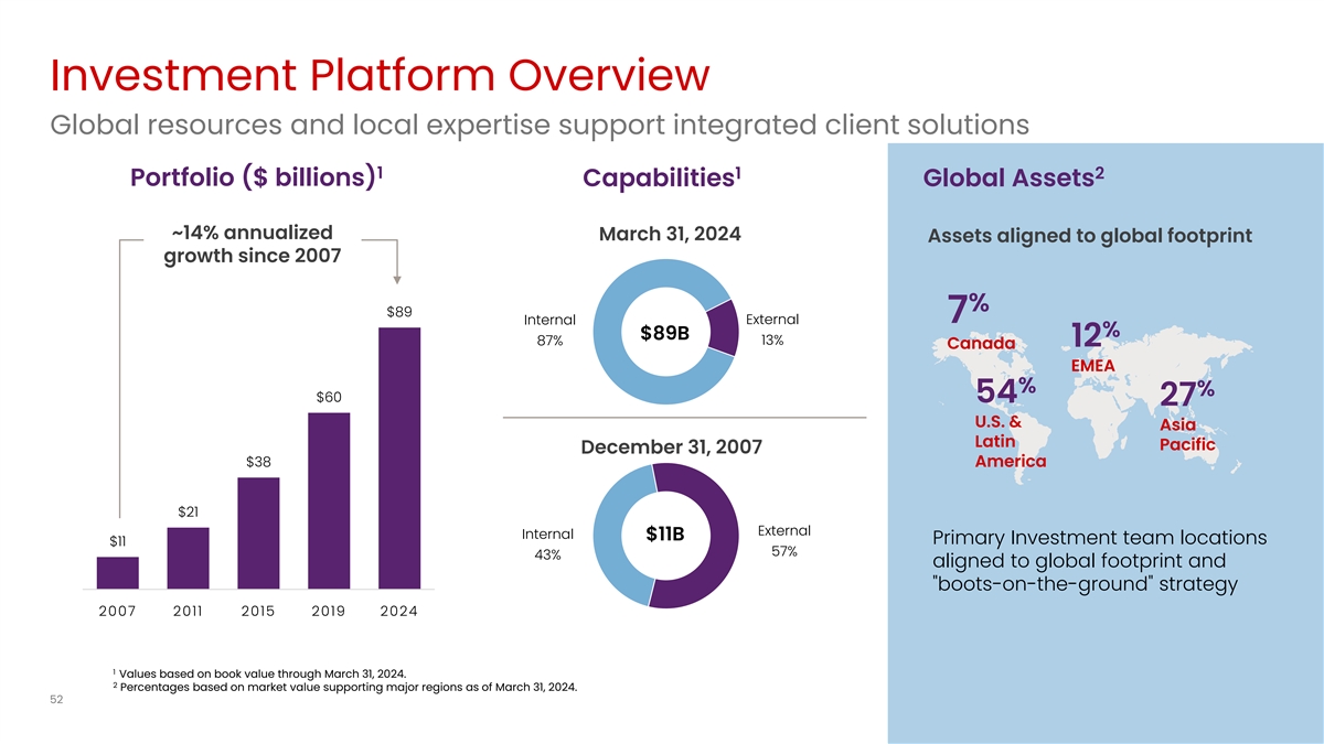 投资平台概览全球资源和本地专业知识支持综合客户解决方案112投资组合(十亿美元)能力全球资产~年化14% 2024年3月31日资产与2007年以来的全球足迹增长% $ 89外部7内部% $ 89B 13% 87% 12加拿大EMEA %% $ 605427美国和亚洲拉丁美洲太平洋2007年12月31日$ 38美国$ 21外部内部$ 11B主要投资团队地点$ 1157% 43%与全球足迹和实地战略一致200720112015201920241基于截至2024年3月31日的账面价值的价值。基于截至2024年3月31日支持主要地区的市值的2%。52