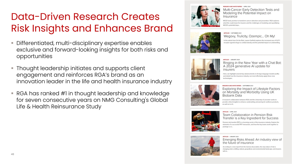 数据驱动的研究创造风险洞察力并提升品牌▪差异化、多学科的专业知识能够为风险和机会提供独家和前瞻性的洞察力▪思想领导力发起并支持客户参与,并加强RGA作为人寿和健康保险行业创新领导者的品牌▪ RGA在NMG Consulting的全球人寿与健康再保险研究48中连续七年在思想领导力和知识方面排名第一