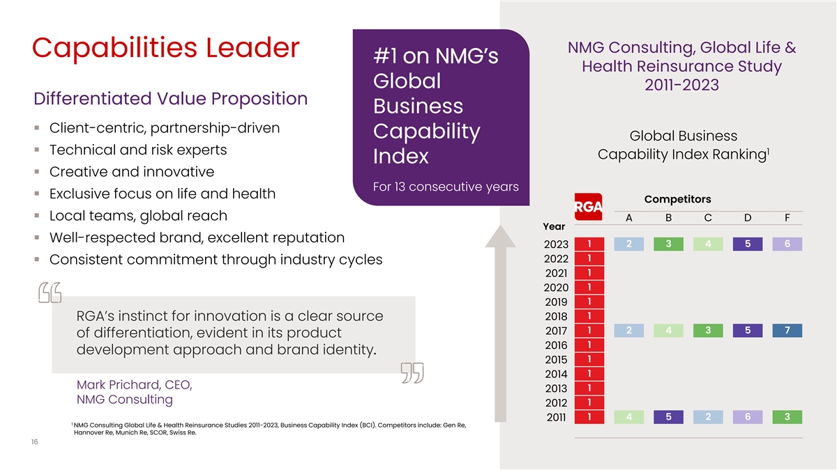 NMG咨询,Global Life & Capabilities Leader # 1 on NMG的健康再保险研究全球2011-2023差异化价值主张业务▪以客户为中心,伙伴关系驱动的能力全球业务▪技术和风险专家1能力指数排名指数▪连续13年独创创新▪专注于生命和健康竞争对手▪本土团队,全球达A B C D F Year ▪备受推崇的品牌,卓越的声誉123456202312022 ▪穿越行业周期的始终如一的承诺12021120201201912018 RGA的创新本能是差异化的明确来源1243572017,这在其产品12016的开发方式和品牌标识中表现得很明显。1201512014 Mark Prichard,首席执行官,12013年NMG咨询12012年1452632011年1 NMG咨询全球人寿与健康再保险研究2011-2023年,业务能力指数(BCI)。竞争对手包括:Gene Re、汉诺威再保险、慕尼黑再保险、SCOR、瑞士再保险。16
