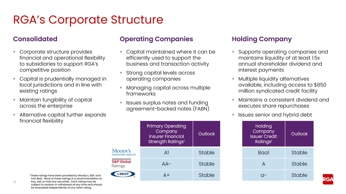 RGA的公司Structure并表运营公司控股公司▪公司结构提供▪在可能的地方维持资本▪支持运营公司并有效地使用财务和运营灵活性来支持向子公司提供至少1.5x的维持流动性,以支持RGA的业务和交易活动年度股东股息和竞争地位利息支付▪强大的资本水平跨越▪资本在运营公司中进行审慎管理▪多种流动性替代方案当地司法管辖区并符合可用条件,包括获得850美元▪跨多个现有评级管理资本百万银团信贷工具框架▪保持资本的可替代性▪保持一致的股息和▪发行盈余票据并为整个企业提供资金执行股票回购协议支持票据(FABN)▪替代资本进一步扩大▪发行高级和混合债务财务灵活性主要运营控股公司公司公司展望保险公司金融发行人信用11实力评级A1稳定Baa1稳定AA-稳定A稳定1这些评级已由穆迪、标普和A +稳定a-稳定A.M. Best提供。这些评级都不是买入、卖出或持有任何证券的建议。每个评级可随时修改或撤销77,应独立于任何其他评级进行评估。