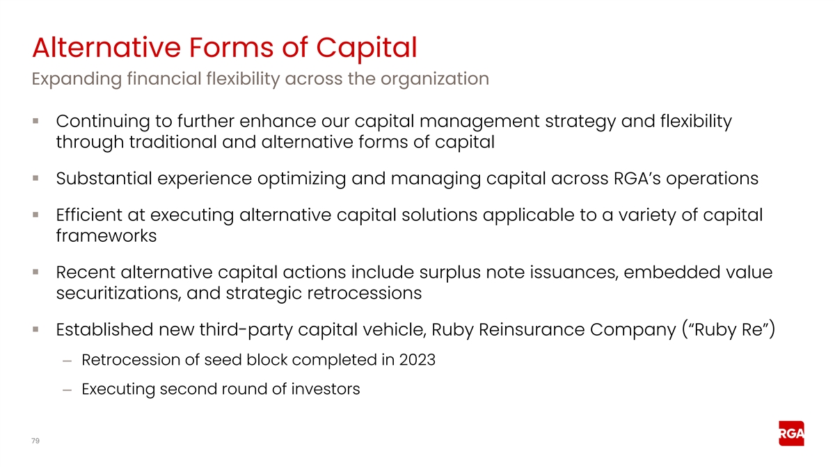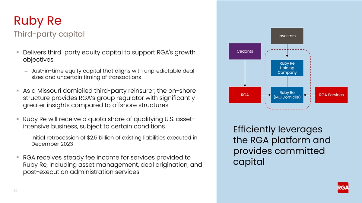 替代形式的资本扩大整个组织的财务灵活性▪继续通过传统和替代形式的资本进一步增强我们的资本管理战略和灵活性▪在RGA运营过程中优化和管理资本的丰富经验▪高效地执行适用于各种资本框架的替代资本解决方案▪最近的替代资本行动包括盈余票据发行、内含价值证券化和战略转分保▪已成立的新的第三方资本载体Ruby ReInsurance Company(“Ruby Re”)– 2023年完成的种子块转分保–执行第二轮投资者79