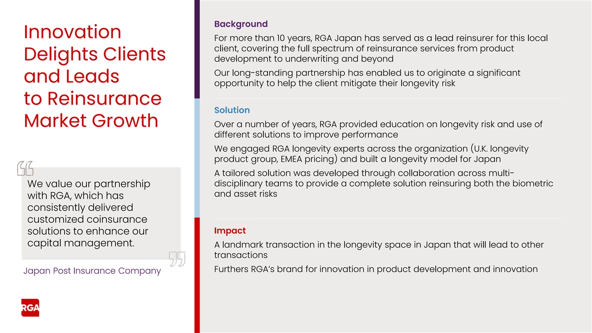 背景创新10多年来,RGA日本一直担任该当地客户的牵头再保险公司,涵盖从产品愉悦客户开发到承保及以后的全方位再保险服务。我们长期的合作伙伴关系使我们能够发起一个重要的并引领机会,帮助客户降低其长寿风险,从而促进再保险解决方案市场的增长。多年来,RGA提供了关于长寿风险的教育,并使用不同的解决方案来提高绩效。我们聘请了整个组织的RGA长寿专家(英国长寿产品组,欧洲、中东和非洲定价)并为日本构建了一个长寿模型。通过跨多学科团队的协作,开发了一个量身定制的解决方案,以提供一个完整的解决方案,同时为生物识别提供再保险。我们重视我们与RGA的合作伙伴关系和资产风险,后者始终提供定制的共同保险影响解决方案,以增强我们的资本管理。日本长寿空间的一项里程碑式交易将导致其他交易,进一步推动RGA在产品开发和创新方面的创新品牌Japan Post Insurance Company