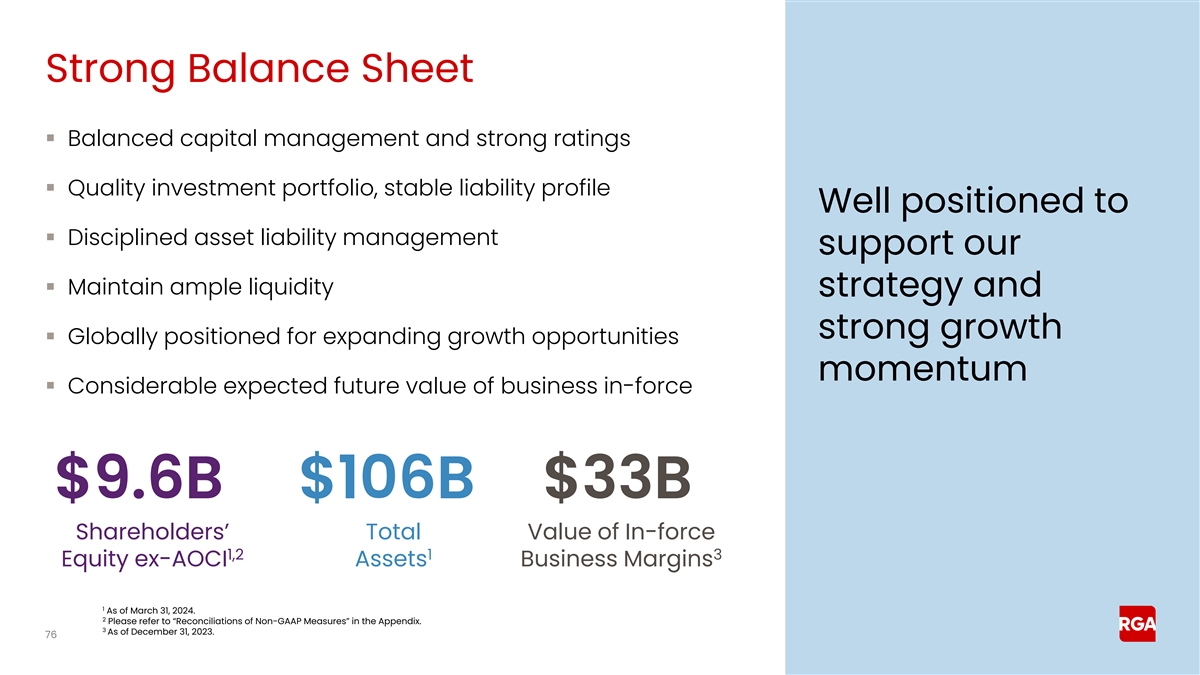 强劲的资产负债表▪平衡的资本管理和强大的评级▪优质的投资组合,稳定的负债状况良好的定位▪有纪律的资产负债管理支持我们▪保持充裕的流动性战略和强劲的增长▪全球处于扩大增长机会势头的位置▪可观的预期未来价值有效业务$ 9.6B $ 106B $ 33B股东的有效总价值1,21截至2024年3月31日,13股权前AOCI资产业务利润率1。2请参阅附录中的“Non-GAAP措施的调节”。3截至2023年12月31日。76
