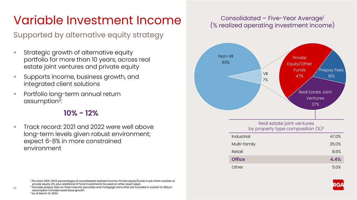1并表–另类股权策略支持的五年平均可变投资收益(%已实现经营投资收益)▪另类股权非VII私募投资组合的战略增长超过10年,跨越实际93%股权/其他房地产合资企业和私募股权基金预付费用VII 47% 16% ▪支持收入、业务增长,和7%的综合客户解决方案Real Joint ▪ Portfolio long-term annual return Ventures 2 assumption:37% 10%-12% real estate joint enterprises ▪ track record:2021 and 2022 were far above 3 by property type composition(%)long-term levels given strong environment;industrial 47.0% expects 6-8 % in more constrained multi-family 35.0% environment Retail 8.6% Office 4.4% Other 5.0%pie chart中的私募股权/基金包括私募股权LP,加上专注于其他资产类型的额外LP基金投资。2不包括包含在总体VII中的固定期限证券和抵押贷款的预付费用。回报61假设包括资产基础增长。3截至2024年3月31日。