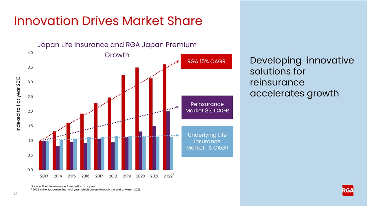 创新推动市场份额日本人寿保险和RGA日本保费4.0增长RGA 15% CAGR为3.0再保险开发创新3.5解决方案加速增长2.5再保险2.0市场8% CAGR 1.5基础人寿1.0保险市场1% CAGR 0.5 0.01 20132014201520162017201820182019202020212022资料来源:日本人寿保险协会。12022是日本财政年度,涵盖到2023年3月底。27在2013年指数化为1