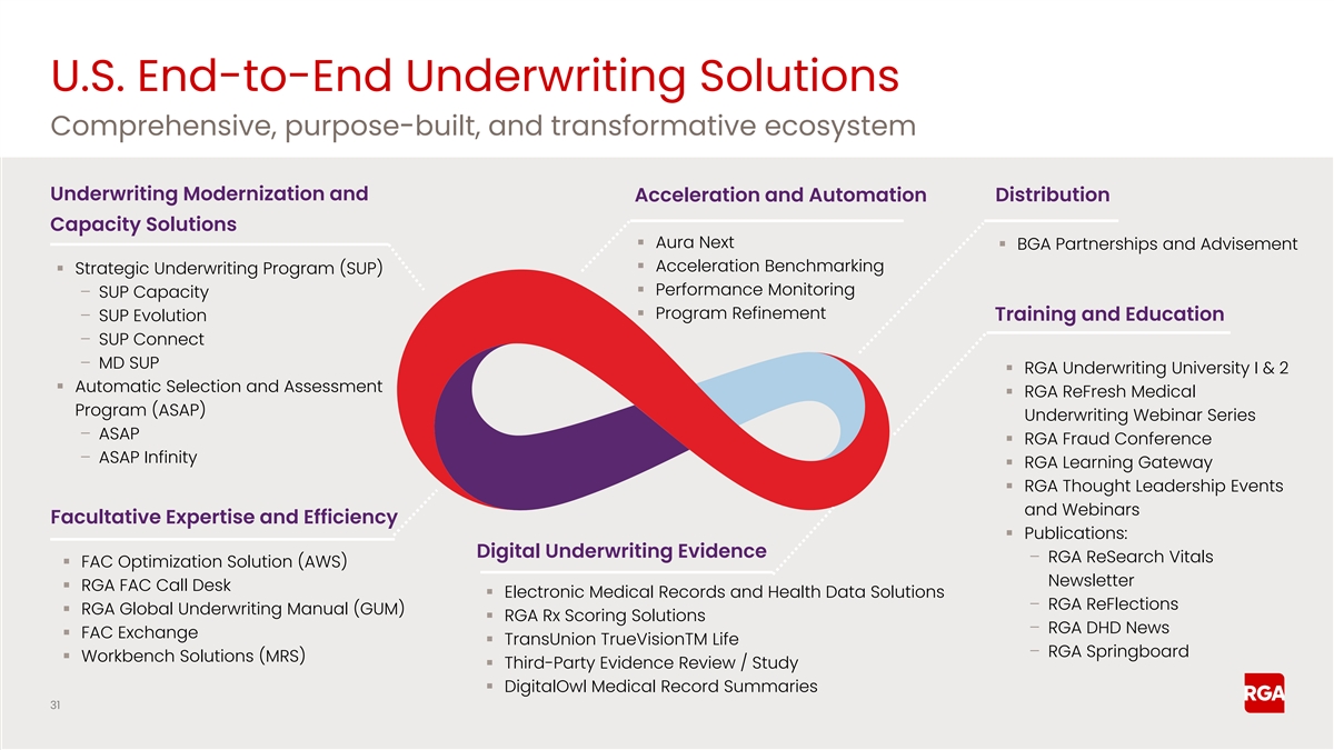 美国端到端承保解决方案全面、专门打造,和变革性生态系统承保现代化和加速度以及自动化分销能力解决方案▪ Aura Next ▪ BGA合作伙伴关系和建议▪加速基准测试▪战略承保计划(SUP)▪绩效监控– SUP能力▪计划细化– SUP演进培训和教育– SUP Connect – MD SUP ▪ RGA承保大学I & 2 ▪自动选择和评估▪ RGA Refresh Medical Program(ASAP)承保网络研讨会系列– ASAP ▪ RGA欺诈会议– ASAP Infinity ▪ RGA学习网关▪ RGA思想领导力活动和网络研讨会兼职专长和效率▪出版物:数字承保证据– RGA ReSearch Vitals ▪ FAC优化解决方案(AWS)通讯▪ RGA FAC Call Desk ▪电子病历和健康数据解决方案– RGA Reflects ▪ RGA Global Underwriting Manual(GUM)▪ RGA RX Scoring Solutions – RGA DHD News ▪ FAC Exchange ▪ TransUnion TrueVisionTM Life – RGA SpringBoard ▪ Workbench Solutions(MRS)▪第三方证据审查/研究▪ DigitalOwl病历摘要31