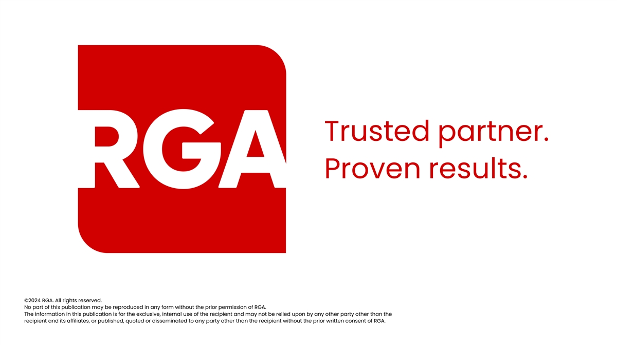 © 2024 RGA。版权所有。未经RGA事先许可,本出版物的任何部分不得以任何形式转载。本出版物中的信息仅供收件人在内部使用,未经RGA事先书面同意,不得被收件人及其关联机构以外的任何其他方所依赖,或向收件人以外的任何一方发布、引用或传播。