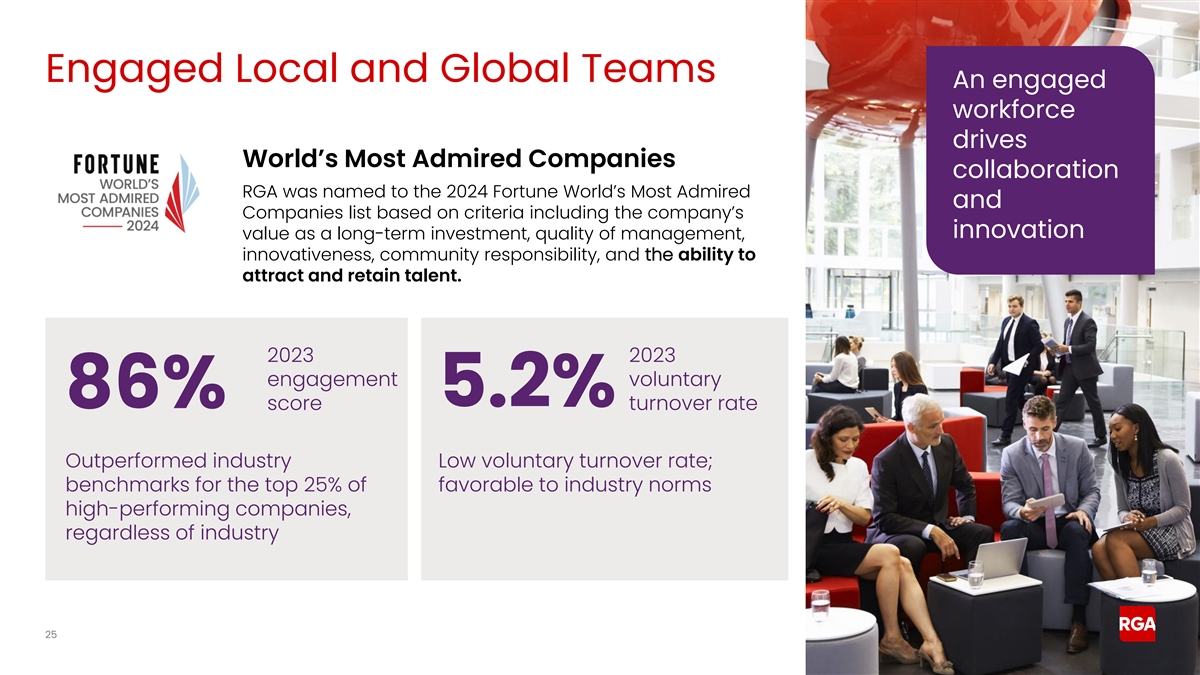 敬业的本地和全球团队敬业的员工队伍推动全球最受尊敬公司协作RGA入选2024年《财富》全球最受尊敬和公司榜单,依据的标准包括公司作为长期投资的创新价值、管理质量、创新性、社区责任感以及吸引和留住人才的能力。20232023敬业自愿5.2% 86%得分离职率跑赢行业低自愿离职率;前25%的基准有利行业规范高绩效公司,不分行业25