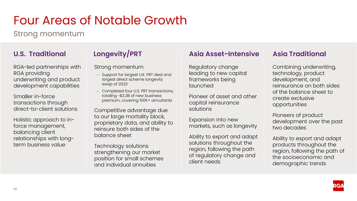四个领域显着增长势头强劲美国传统长寿/PRT亚洲资产密集型亚洲传统RGA牵头的合作伙伴关系势头强劲监管变革结合承保、RGA提供领先的新资本技术、产品–支持英国最大的TERMTPRT交易和正在开发的最大直接计划长寿承保和产品框架,以及互换2023发展能力在双方推出再保险–完成四笔美国PRTTERM3交易,资产负债表的总额约为3.3B美元的新业务较小有效的资产先锋和其他创造独家溢价,通过资本再保险机会覆盖100K +年金受益人交易直接面向客户的解决方案产品先驱应得的竞争优势我们的大死亡率块,整体方法in-扩展到新的发展超过了过去的专有数据,并有能力倒逼管理,市场,如长寿二十年再保险平衡客户资产负债表两侧的Ability输出和调整关系的长期-Ability在整个技术解决方案区域的整个期限内输出和调整解决方案商业价值产品,遵循路径区域,遵循加强我们市场的监管变化和小规模计划的社会经济和地位的路径客户需要人口趋势和个人年金30