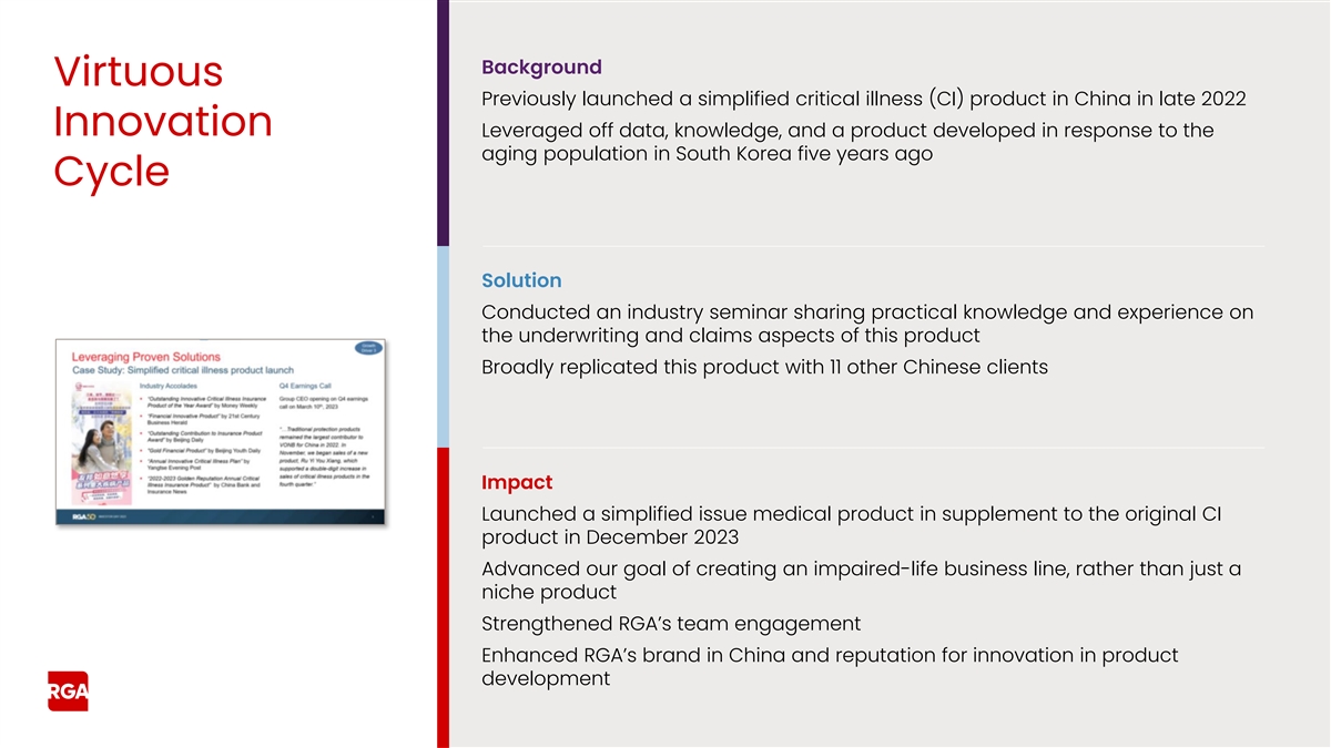 Background Virtuous此前于2022年底在中国推出简化重疾(CI)产品创新利用数据、知识和五年前针对韩国人口老龄化开发的产品Cycle Solution举办了一场行业研讨会,就该产品的承保和索赔方面分享实用知识和经验与其他11家中国客户广泛复制该产品Impact于2023年12月在原有CI产品的补充下推出了简化问题医疗产品,推进了我们创建生命受损业务线的目标,而不仅仅是一款小众产品加强了RGA的团队敬业度增强了RGA在中国的品牌和产品开发创新的美誉度