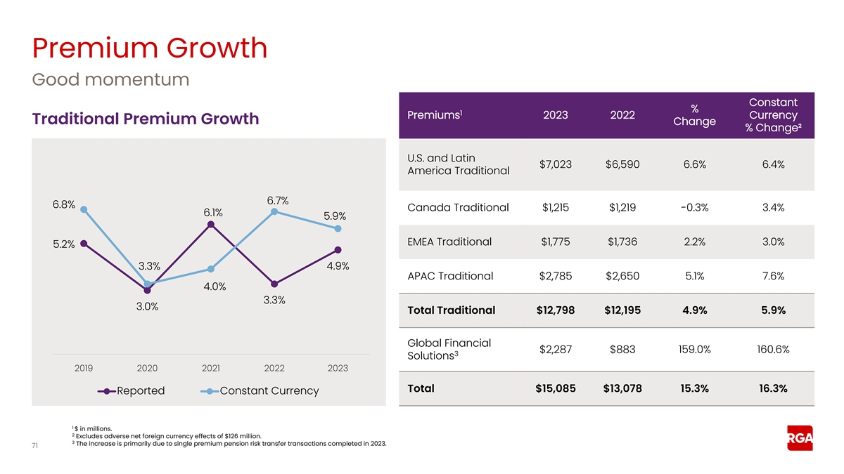 保费增长良好势头不变% 1保费20232022货币传统保费增长变动%变化²美国和拉丁7,023美元6,5906.6% 6.4%美洲传统6.7% 6.8%加拿大传统1,215美元1,219美元-0.3 % 3.4% 6.1% 5.9%欧洲、中东和非洲传统1,775美元1,736美元2.2% 3.0% 5.2% 3.3% 4.9%亚太地区传统2,785美元2,6505.1% 7.6% 4.0% 3.3% 3.0%传统总额12,798美元12,1954.9% 5.9%全球金融2,287美元883159.0% 160.6% 3解决方案20192020202120222023总额15,085美元13,07815.3% 16.3%报告的固定货币1美元百万。2不包括1.26亿美元的不利外汇净影响。3这一增长主要是由于2023年完成的单一保费养老金风险转移交易。71