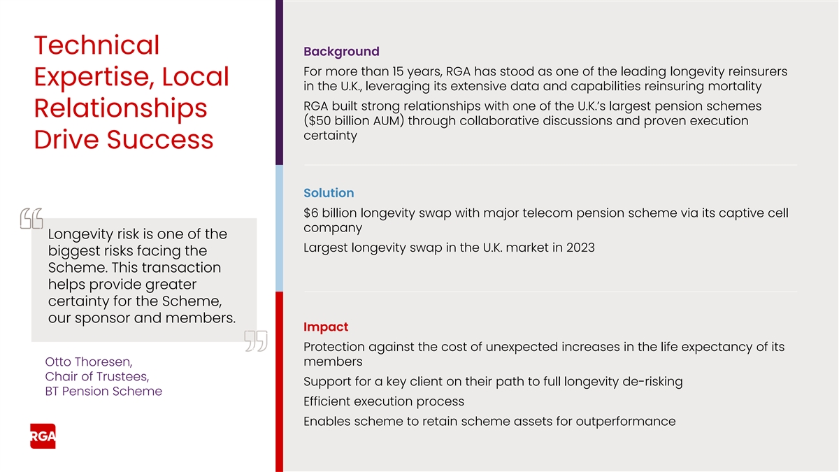 超过15年的技术背景,RGA一直是英国本土领先的长寿再保险公司专长之一,利用其广泛的数据和能力为死亡率提供再保险,RGA通过合作讨论和经过验证的执行确定性驱动成功解决方案,与英国最大的养老金计划之一建立了牢固的关系(500亿美元AUM),通过其专属细胞公司与主要电信养老金计划进行60亿美元的长寿互换,长寿风险是2023年英国市场上最大的长寿互换计划面临的最大风险之一。这项交易有助于为该计划、我们的发起人和成员提供更大的确定性。为其预期寿命意外增加的成本提供影响保护Otto Thoresen,受托机构成员主席,支持关键客户迈向全面长寿去风险BT养老金计划高效的执行流程使计划能够保留计划资产以获得优异表现