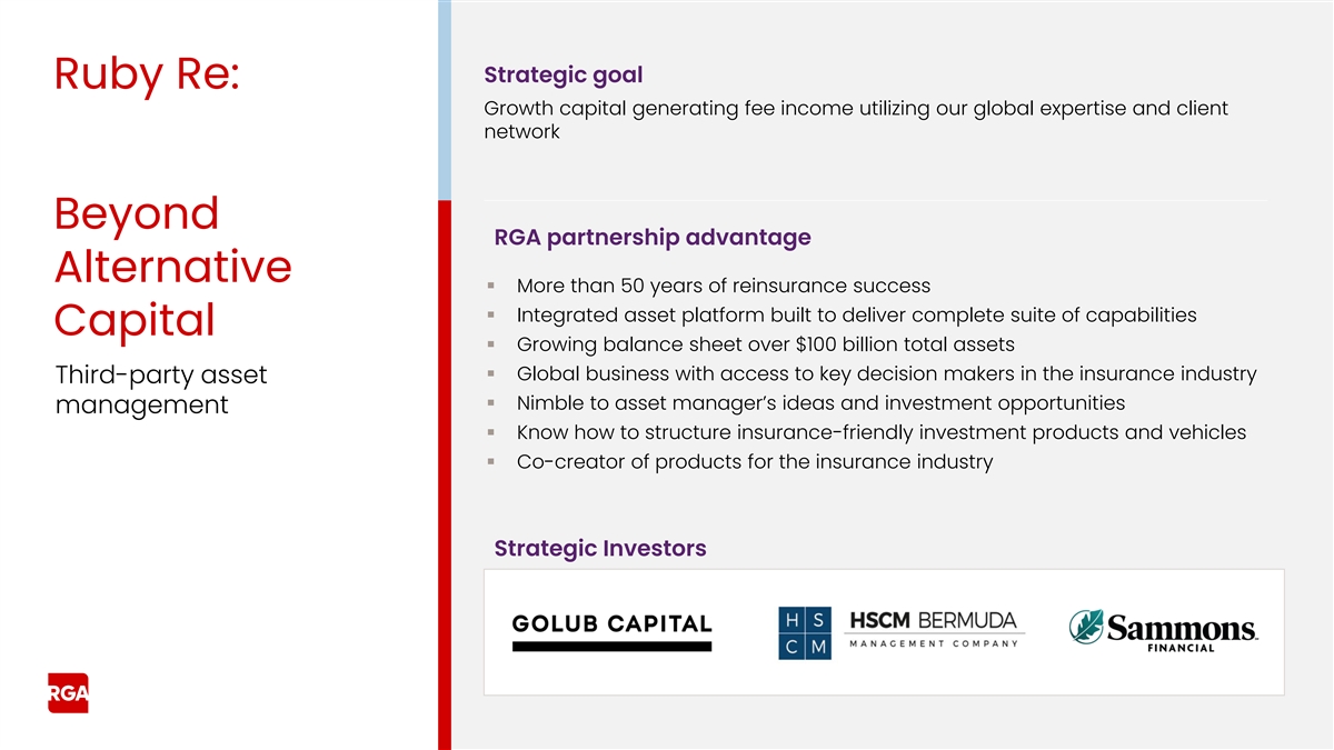 战略目标Ruby Re:利用我们的全球专业知识和客户网络产生费用收入的成长型资本超越RGA合作伙伴优势替代方案▪ 50多年的再保险成功▪为提供一整套能力而构建的综合资产平台资本▪不断增长的资产负债表总资产超过1000亿美元▪全球业务,可接触保险业关键决策者第三方资产▪灵活了解资产管理人的想法和投资机会管理▪知道如何构建保险友好型投资产品和载体▪为保险业战略投资者共同创建产品