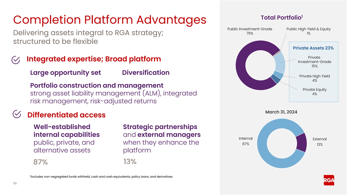1总投资组合完成平台优势公募投资级公募高收益&股权76% 1%交付RGA战略不可或缺的资产;结构为灵活的私募资产23%私募综合专长;广义平台投资级15%大机会集多元化私募高收益4%投资组合构建和管理私募股权4%强资产负债管理(ALM)、综合风险管理、风险调整后回报2024年3月31日差异化准入成熟的战略合作伙伴内部能力和外部管理人内部外部公、私、当他们增强87% 13%另类资产平台13% 87% 1不包括扣非分离资金、现金及现金等价物,保单贷款和衍生品。56