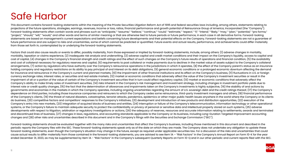 安全港本文件包含1995年《私人证券诉讼改革法案》和联邦证券法含义内的前瞻性陈述,其中包括与对美国再保险集团公司(“公司”)未来运营、战略、收益、收入、收入或亏损、比率、财务业绩和增长潜力的预测有关的陈述。前瞻性陈述通常包含诸如“预期”、“假设”、“相信”、“继续”、“可能”、“估计”、“预期”、“如果”、“打算”、“可能”、“可能”、“计划”、“潜在”、“备考”、“项目”、“应该”、“将”、“将”等词语和短语,以及其他类似含义或与未来期间或未来业绩相关的词语和术语,在每种情况下均为所有衍生形式。前瞻性陈述是基于管理层目前对未来发展及其对公司的潜在影响的预期和信念。前瞻性陈述并非对未来业绩的保证,并受到风险和不确定性的影响,其中一些风险和不确定性无法预测或量化。未来事件和实际结果、业绩和成就可能与前瞻性陈述中所述、预期或所依据的内容存在重大差异。也可能导致结果或事件与前瞻性陈述明示或暗示的结果或事件存在重大差异的因素包括,除其他外:(1)死亡率、发病率、失效或索赔经历的不利变化,(2)风险分析和承保不足,(3)不利的资本和信贷市场条件及其对公司流动性、获得资本和资本成本的影响,(4)公司财务实力和信用评级的变化以及此类变化对公司未来经营业绩和财务状况的影响,(5)监管准备金和资本所必需的抵押品的可用性和成本,(6)要求因受公司抵押品安排约束的资产的市场价值下跌而过账抵押品或支付款项,(7)对公司在其经营所在司法管辖区的再保险业务拥有权力的监管机构采取的行动,(8)公司母公司作为保险控股公司的地位及其支付债务本金和利息的能力的监管限制的影响,(9)一般经济状况或长期经济衰退影响公司当前和计划中市场的保险和再保险需求,(10)其他金融机构的减值及其对公司业务的影响,(11)美元或外币汇率、利率或证券和房地产市场的波动,(12)市场或经济状况对公司投资证券的价值产生不利影响或导致公司某些投资证券的全部或部分价值发生减值进而可能影响监管资本,(13)对公司及时出售投资证券的能力产生不利影响的市场或经济条件,(14)公司风险管理和投资策略中固有的风险,包括投资组合收益率因利率或信用质量变化而发生的变化,(15)对公司投资计提的备抵和减值的确定具有高度主观性,(16)公司经营所在市场的政府和经济体的稳定性和行动,包括美国主权债务金额及其信用评级的持续不确定,(17)公司对第三方的依赖,包括公司将部分再保险、第三方投资管理人等分给的保险公司和再保险公司,(18)公司客户的财务表现,(19)公司或其客户开展业务的世界任何地方的自然灾害、灾难、恐怖袭击、流行病、流行病或其他重大公共卫生问题的威胁,(20)竞争因素和竞争对手对公司举措的反应,(21)开发和引入新产品和分销机会,(22)执行公司进入新市场,(23)整合收购的业务块和实体,(24)公司的电信、信息技术或其他运营系统中断或故障,或公司未能保持足够的安全性以保护存储在这些系统上的个人或敏感数据和知识产权的机密性或隐私,(25)与诉讼、仲裁或监管调查或行动有关的不利发展,(26)与和解、裁决以及终止和终止的业务线有关的储备、资源和准确信息是否充足, (27)适用于公司或其业务的法律、法规和会计准则的变更,包括长期定向改进会计变更和(28)本文件和公司向美国证券交易委员会(“SEC”)提交的文件中描述的其他风险和不确定性。前瞻性陈述应与影响公司业务的许多风险和不确定性一起评估,包括本文件中提到的以及公司向SEC提交的定期报告中描述的风险和不确定性。这些前瞻性陈述仅在作出之日起生效。公司不承担更新这些前瞻性陈述的任何义务,即使公司的情况可能在未来发生变化,但适用的证券法要求除外。有关可能导致实际结果与前瞻性陈述中包含的结果存在重大差异的风险和不确定性的讨论,建议您参阅公司截至2023年12月31日止年度的10-K表格年度报告中的项目1A –“风险因素”,该项目可能由公司随后的10-Q表格季度报告中的项目1A –“风险因素”以及我们向SEC提交的其他定期报告和当前报告中的项目1A –“风险因素”补充。11