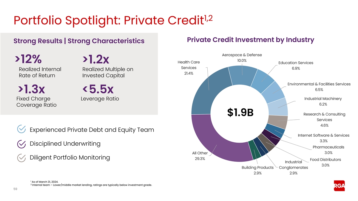 1,2投资组合聚焦:按行业划分的私人信贷私人信贷投资强劲业绩|强特色航空航天与国防10.0% > 12% > 1.2x医疗保健教育服务服务6.9%实现内部实现倍数21.4%回报率投资资本环境与设施服务6.5% > 1.3x < 5.5x工业机械固定收费杠杆率6.2%覆盖率研究咨询$ 1.9B服务4.6%经验丰富的私人债务和股权团队互联网软件与服务3.3%纪律严明的承销医药3.0%所有其他勤勉的投资组合监测29.3%食品分销商工业3.0%建筑产品集团2.9% 2.9% 1截至2024年3月31日。2内部团队–较低/中等市场贷款,评级通常低于投资级别。59