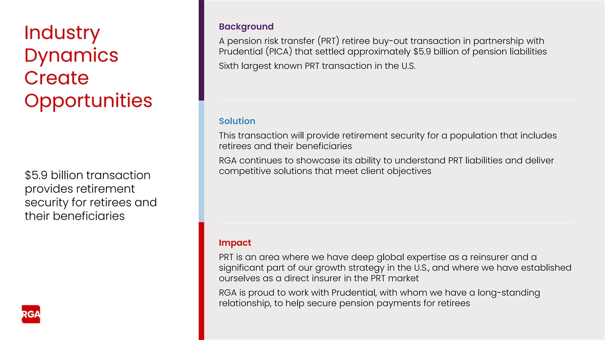 背景行业与保诚(PICA)合作开展的一项养老金风险转移(PRT)退休人员收购交易,解决了约59亿美元的养老金负债动态已知的美国第六大PRT交易Create Opportunities Solution该交易将为包括退休人员及其受益人RGA在内的人群提供退休保障,继续展示其理解PRT负债和提供有竞争力的解决方案的能力满足客户目标59亿美元的交易为退休人员及其受益人提供退休保障Impact PRT是我们作为再保险公司在全球拥有深厚专业知识的领域,也是我们在美国增长战略的重要组成部分,在这个领域我们已经确立了自己作为PRT市场直接保险公司的地位,RGA很自豪能与我们有着长期合作关系的保诚合作,帮助确保退休人员的养老金支付