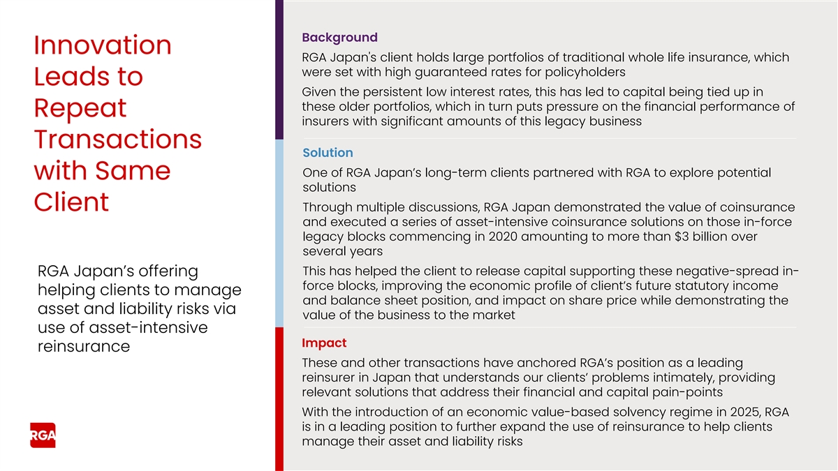 背景创新RGA日本的客户持有大量传统终身寿险的投资组合,这些保险为投保人设定了较高的保证费率,这导致在利率持续较低的情况下,这导致资金被占用在这些较旧的投资组合中,这反过来又对拥有大量这一传统业务的重复保险公司的财务业绩造成压力。Transactions Solution One of RGA Japan的长期客户与RGA合作,通过多方讨论与Same Solution Client发掘潜力,RGA日本展示了共同保险的价值,并在几年内对那些从2020年开始的有效遗留区块执行了一系列资产密集型共同保险解决方案,金额超过30亿美元,这有助于客户释放资本来支持这些负利差-RGA日本提供力量区块,改善客户未来法定收入的经济状况,帮助客户进行管理和资产负债表状况,和对股价的影响,同时通过业务价值向市场展示资产负债风险使用资产密集型影响再保险这些交易和其他交易奠定了RGA作为日本领先的再保险公司的地位,该公司深入了解客户的问题,提供解决其财务和资本痛点的相关解决方案随着2025年基于经济价值的偿付能力制度的引入,RGA处于领先地位,可以进一步扩大使用再保险来帮助客户管理其资产负债风险