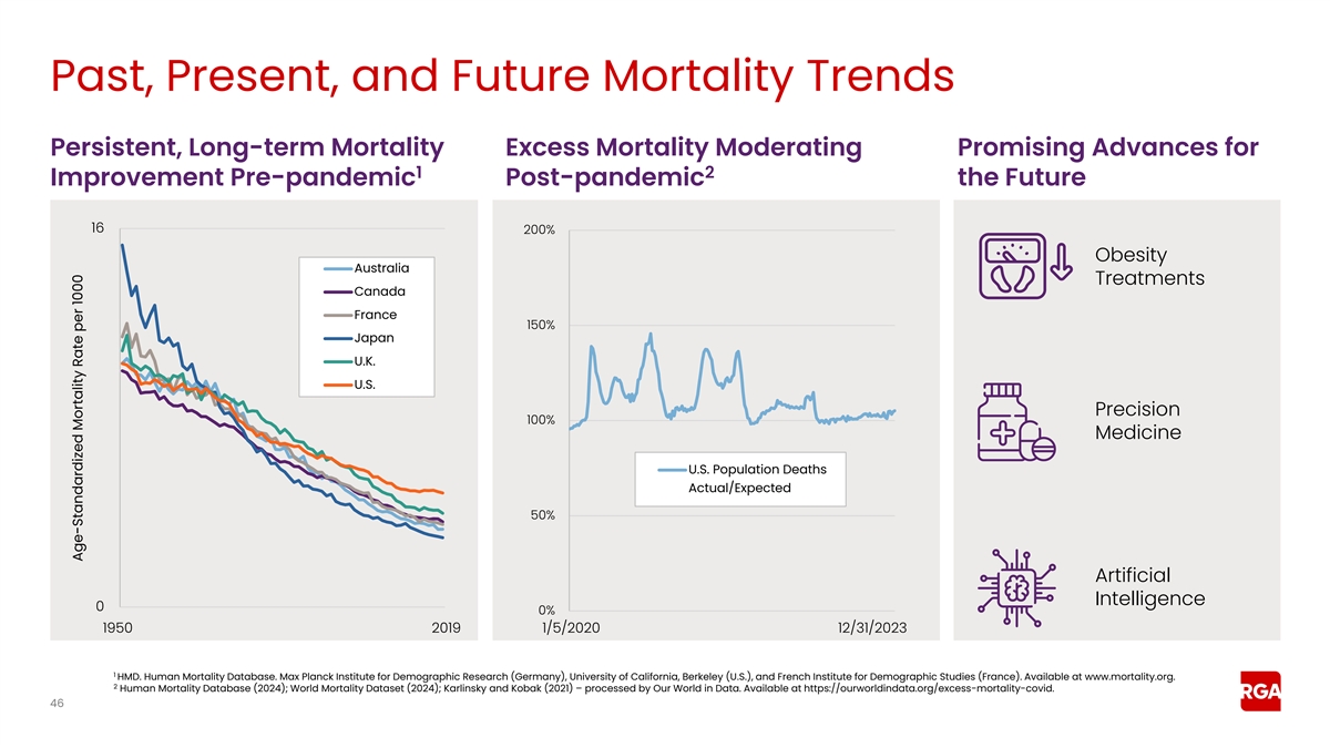 过去、现在和未来的死亡率趋势持续存在,长期死亡率超额死亡率调节有希望的进展12改善大流行前大流行后的未来16200%肥胖澳大利亚治疗加拿大法国150%日本英国美国精准100%医学美国人口死亡实际/预期50%人工智能000% 195020191/5/202012/31/2023 1 HMD。人类死亡率数据库。马克斯·普朗克人口研究所(德国)、加州大学伯克利分校(美国)、法国人口研究所(法国)。可查阅www.mortality.org。2 Human Mortality Database(2024);World Mortality Dataset(2024);Karlinsky and Kobak(2021)– Our World in Data处理。可在https://ourworldindata.org/excess-mortality-covid查阅。每1000人中有46例年龄标准化死亡率