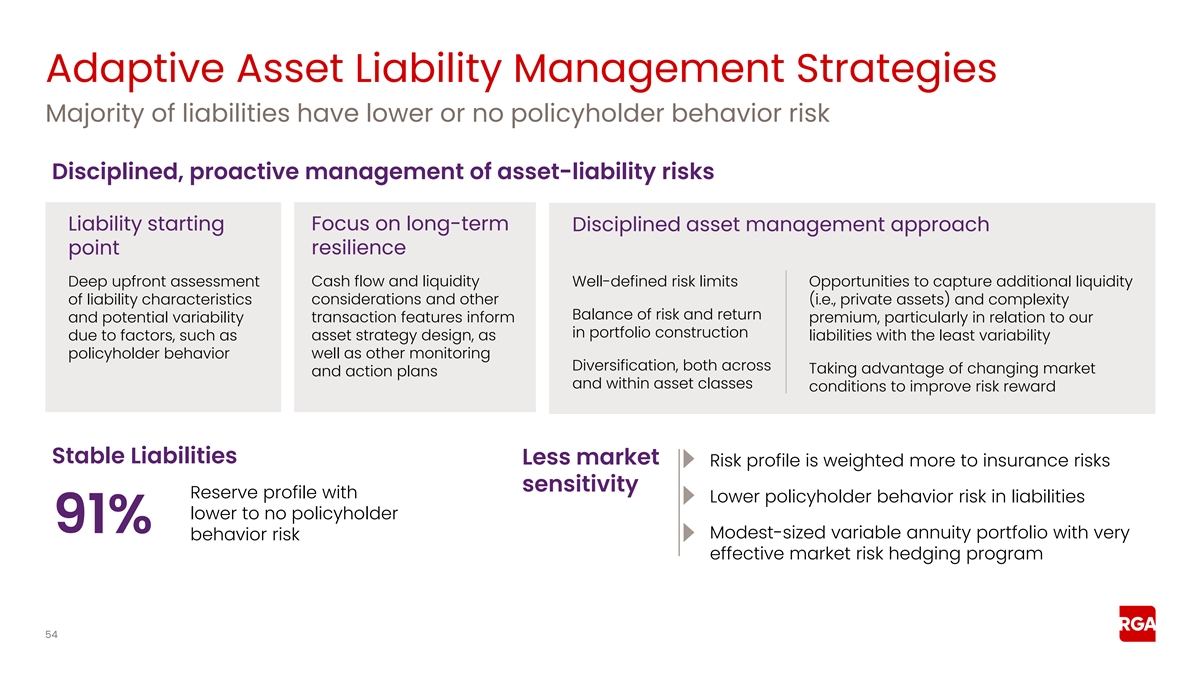适应性资产负债管理策略大多数负债具有较低或没有投保人行为风险纪律性,主动管理资产负债风险侧重长期负债起始纪律性资产管理方法点韧性深度前期评估现金流和流动性明确定义的风险限制捕捉额外流动性的机会负债特征考虑因素和其他(即私人资产)和复杂性风险和收益的平衡以及潜在的可变性交易特征告知溢价,特别是与我们在组合构建资产策略设计相关的因素,例如可变性最小的负债投保人行为以及其他监测多样化,综合利用不断变化的市场和行动计划并在资产类别条件内提高风险回报稳定负债较少的市场风险状况更多地加权到保险风险敏感性准备金状况与较低的保单持有人行为风险负债低于无保单持有人91%中等规模的可变年金组合与非常行为风险有效的市场风险对冲方案54