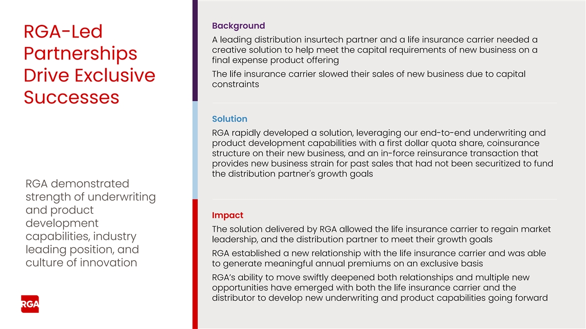 背景RGA领导的一家领先的分销保险科技合作伙伴和一家人寿保险公司需要一个创造性的解决方案,以帮助满足Partnerships最终费用产品上新业务的资本要求。该人寿保险公司由于资本驱动的专属限制,放慢了新业务的销售速度。成功解决方案RGA迅速开发了一个解决方案,利用我们的端到端承保和产品开发能力,第一美元额度份额,共同保险结构在他们的新业务上,以及一项有效的再保险交易,该交易为过去未证券化的销售提供新的业务压力,以为分销合作伙伴的增长目标提供资金,RGA展示了承保和产品影响开发的实力RGA提供的解决方案让这家人寿保险承运人重新获得市场能力、行业领导地位,并让分销合作伙伴重新获得满足其增长目标的领先地位,而RGA与寿险承保人建立了新的关系并能够创新文化以排他性方式产生有意义的年度保费RGA的快速行动能力加深了与寿险承保人和分销商双方的关系,并出现了发展新的承保和产品能力的多重新机遇