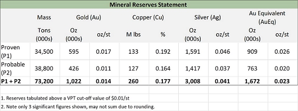 | 平均AuEQ品位所含(矿山寿命) | 0.023盎司/吨(每吨0.78克AuEq) |