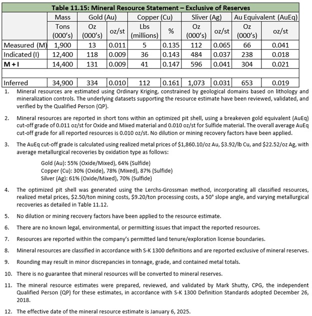 | ● | 矿产储量167.2万AuEq盎司,支持8年的矿山寿命和10年的加工。其中包括102.2万盎司黄金、2.597亿磅铜和300.8万盎司白银——比之前的PFS中反映的AuEQ盎司增加了16%。 |