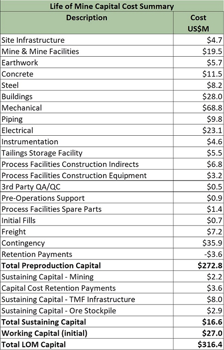 PFS估计,初始项目资本成本约为2.77亿美元,其中包括开发地面矿山和设施、建造一个年产720万吨的加工厂,包括初级破碎、研磨、浮选、尾矿和精矿过滤、一个全衬里的第一阶段干尾矿储存设施,以及额外的基础设施,包括运输和通道道路、供水、配电和现场服务以及投产第一年的初始资本保持器。