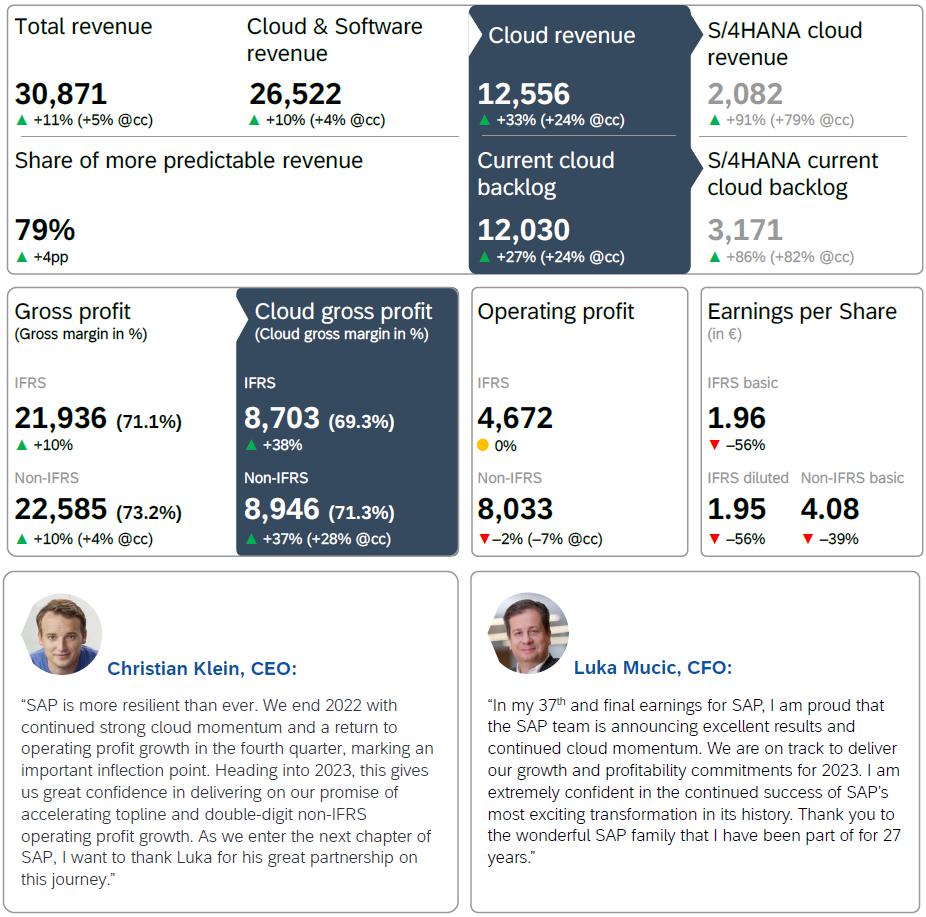 | 德国瓦尔多夫– 2023年1月26日。 SAP SE(纽约证券交易所代码:SAP)今天发布了截至2022年12月31日的第四季度及财年财务业绩。 |