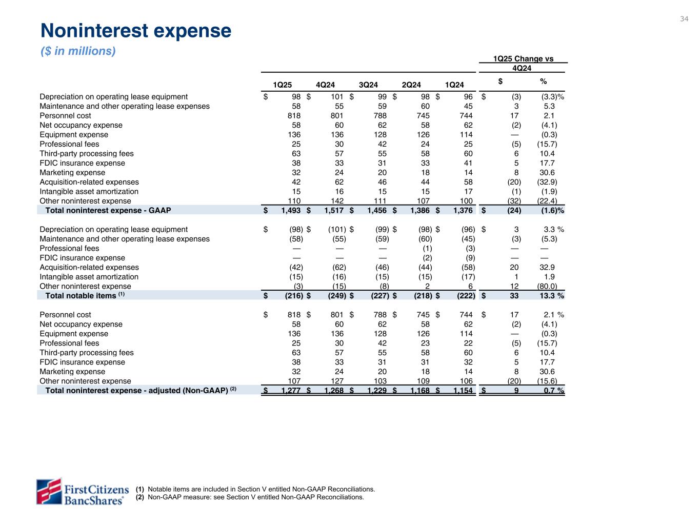 33非利息收入(百万美元)1Q25变化vs 4Q24 1Q25 4Q24 3Q24 2Q24 1Q24 $%经营租赁设备租金收入$ 270 $ 272 $ 262 $ 259 $ 255 $(2)(1.2)%借贷相关费用6668676359(2)(2.9)存款费和服务费5858575758 —(0.5)客户投资费5354555450(1)(2.6)财富管理服务5654545124.5国际费用3233292928(1)(1.5)保理佣金1720191917(3)(13.4)持卡人服务,净额4141424040 — 0.1商户服务,净额1413121212.5保险佣金141314131518.9出售投资证券已实现收益,净额— 24 ——(2)(100.0)可出售股本证券公允价值调整,净额(5)109(2)(4)(15)(149.8)出售租赁设备收益,净额5115410(6)(50.9)债务清偿损失————(2)——其他非利息收入1450213938(36)(73.0)非利息收入总额-GAAP $ 635 $ 699 $ 650 $ 639 $ 627 $(64)(9.3)%经营租赁设备折旧和维护费用(1)$(156)$(152)$(158)$(158)$(141)$(4)(2.6)%出售投资证券的已实现收益净额——(2)(4)—— 2100.0有价股本证券的公允价值调整,净额5(10)(9)2415149.8出售租赁设备收益,净额(5)(11)(5)(4)(10)650.9债务清偿损失———— 2 ——其他非利息收入——(8)——(4)8(100.0)值得注意的项目总数(2)$(156)$(183)$(176)$(160)$(149)$ 2714.8%经营租赁设备调整后租金收入(1)$ 114 $ 120 $ 104 $ 101 $ 114 $(6)(5.5)%借贷相关费用6668676359(2)(2.9)存款费及服务费5858575758 —(0.5)客户投资费5354555450(1)(2.6)理财服务565454525124.5国际费用3233292928(1)(1.5)保理佣金1720191917(3)(13.4)持卡人服务,净额4141424040 — 0.1商户服务,净额141312121212.5保险佣金141314131518.9其他非利息收入1442213934(28)(68.1)非利息收入总额-调整后(Non-GAAP)(3)$ 479 $ 516 $ 474 $ 479 $ 478 $(37)(7.4)%(1)经营租赁设备折旧包括24年第四季度铁路资产减值400万美元。400万美元的减值是一个值得注意的项目,不包括在经营租赁设备的调整后租金收入中。见题为Non-GAAP和解的第五节。(2)值得注意的项目包含在题为Non-GAAP调节的第V节中。(3)Non-GAAP衡量:见题为Non-GAAP调节的第五节。