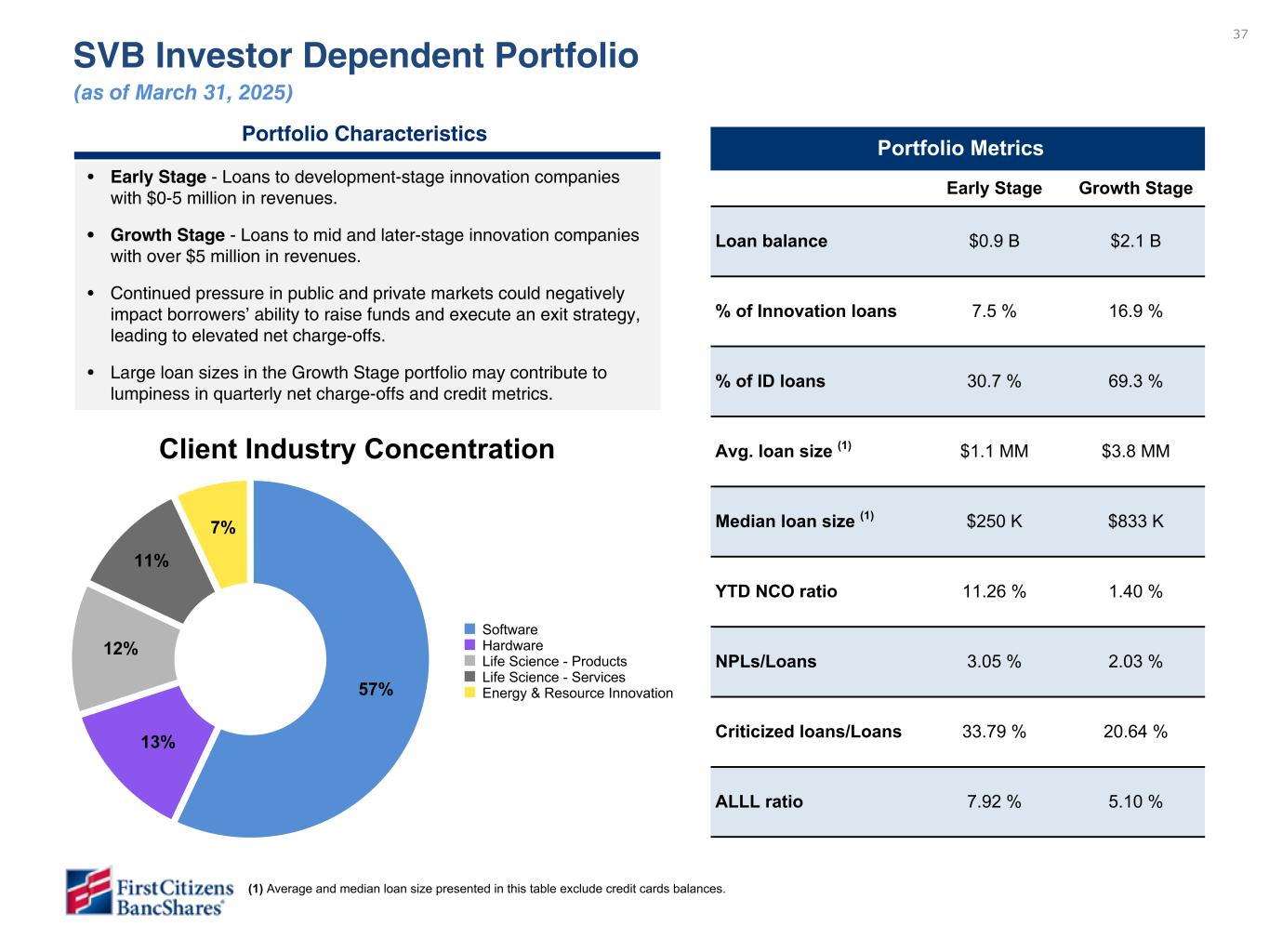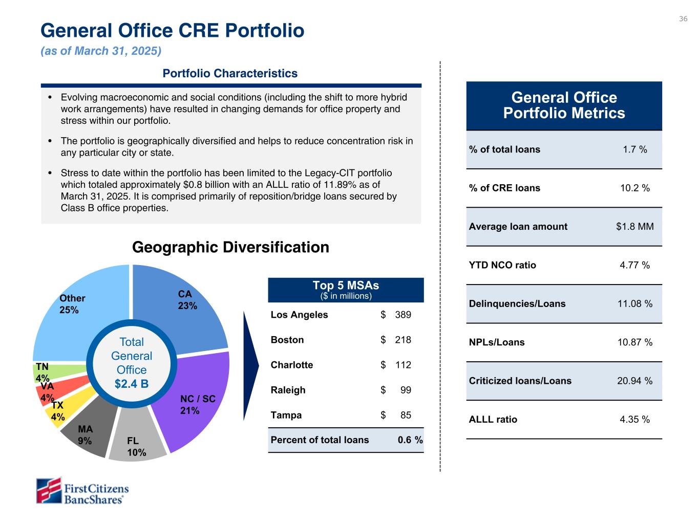 聚焦35个贷款组合(十亿美元,截至3月31日,2025年)贷款总额141.4美元贷款总额CRE 23.4美元CRE投资组合构成余额占贷款总额的百分比多户家庭4.5美元3.2%医疗办公室3.7 2.6工业/仓库3.6 2.6一般办公室2.4 1.7传统-CIT投资组合0.8 0.6其他1.6 1.1零售1.9 1.3医疗保健1.3 0.9酒店/汽车旅馆0.9 0.6其他5.1 3.6总额23.4美元16.5%创新投资组合构成余额占贷款总额的百分比创新C & I和现金流依赖$ 9.16.5%投资者依赖-成长阶段2.1 1.5投资者依赖-早期阶段0.9 0.6总计$ 12.18.6%创新$ 12.1注–这些表中CRE的定义与商业房地产的监管指导一致,包括以下内容:建筑贷款(1.a.1和1.a.2),主要还款来自第三方租金收入的贷款(1.d和1.e.2),以及不以房地产为抵押但以房地产为目的的贷款(4.a、8和9)。由于四舍五入的关系,总数可能不够足。CRE数据仍在审查中,因为我们仍在通过内部验证