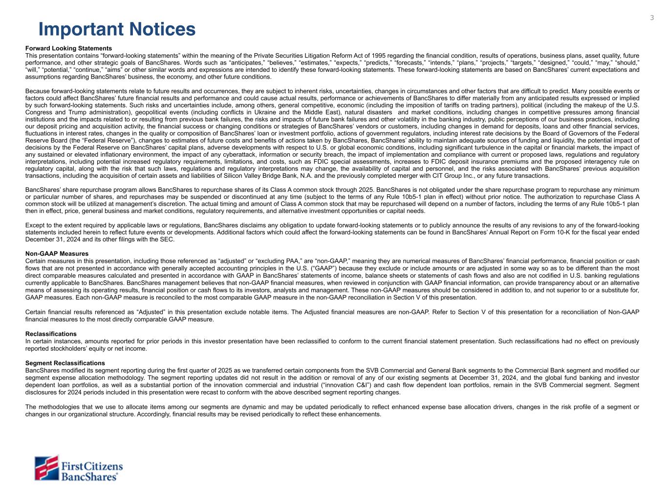 3前瞻性陈述本演示文稿包含1995年《私人证券诉讼改革法案》含义内关于BancShares的财务状况、运营结果、业务计划、资产质量、未来业绩和其他战略目标的“前瞻性陈述”。“预期”、“相信”、“估计”、“预期”、“预测”、“预测”、“打算”、“计划”、“项目”、“目标”、“设计”、“可能”、“可能”、“应该”、“将”、“潜在”、“继续”、“目标”或其他类似词语和表达旨在识别这些前瞻性陈述。这些前瞻性陈述基于BancShares当前对BancShares业务、经济和其他未来状况的预期和假设。由于前瞻性陈述涉及未来的结果和事件,它们受到固有风险、不确定性、环境变化和其他难以预测的因素的影响。许多可能的事件或因素可能会影响BancShares未来的财务业绩和业绩,并可能导致BancShares的实际业绩、业绩或成就与此类前瞻性陈述明示或暗示的任何预期结果存在重大差异。此类风险和不确定性包括(其中包括)一般竞争、经济(包括对贸易伙伴征收关税)、政治(包括美国国会和特朗普政府的构成)、地缘政治事件(包括乌克兰和中东冲突)、自然灾害和市场状况,包括金融机构之间竞争压力的变化以及与先前银行倒闭相关或导致的影响、未来银行倒闭的风险和影响以及银行业的其他波动、公众对我们的商业行为的看法,包括我们的存款定价和收购活动,BancShares的供应商或客户的财务成功或不断变化的条件或战略,包括存款、贷款和其他金融服务需求的变化、利率的波动、BancShares贷款或投资组合的质量或构成的变化、政府监管机构的行动,包括联邦储备委员会(“美联储”)理事会的利率决定、对BancShares所采取行动的未来成本和收益估计的变化、BancShares维持充足资金来源和流动性的能力、美联储决定对BancShares资本计划的潜在影响,美国或全球经济状况的不利发展,包括资本或金融市场的重大动荡、任何持续或加剧的通胀环境的影响、任何网络攻击、信息或安全漏洞的影响、实施和遵守现行或拟议的法律、法规和监管解释的影响,包括潜在增加的监管要求、限制和成本,例如FDIC特别评估、增加FDIC存款保险费和拟议的监管资本机构间规则,以及此类法律、法规和监管解释可能发生变化的风险、资本和人员的可用性,以及与BancShares之前的收购交易相关的风险,包括收购Silicon Valley Bridge Bank,N.A.的某些资产和负债以及之前与CIT Group Inc.完成的合并,或任何未来的交易。BancShares的股票回购计划允许BancShares在2025年之前回购其A类普通股的股票。根据股份回购计划,BancShares没有义务回购任何最低或特定数量的股份,并且可以随时暂停或终止回购(受制于任何有效的规则10b5-1计划的条款),而无需事先通知。回购A类普通股的授权将由管理层酌情使用。可能回购的A类普通股的实际时间和数量将取决于许多因素,包括当时生效的任何规则10b5-1计划的条款、价格、一般商业和市场条件、监管要求以及另类投资机会或资本需求。除适用法律或法规要求的范围外,BancShares不承担更新前瞻性陈述或公开宣布对此处包含的任何前瞻性陈述的任何修订结果以反映未来事件或发展的任何义务。可能影响前瞻性陈述的其他因素可在BancShares截至2024年12月31日的财政年度的10-K表格年度报告及其提交给SEC的其他文件中找到。非公认会计原则措施本演示文稿中的某些措施, 包括那些被称为“调整后”或“不包括PAA”的是“非GAAP”,这意味着它们是BancShares财务业绩、财务状况或现金流量的数字衡量标准,不是按照美国公认会计原则(“GAAP”)列报的,因为它们不包括或包括金额,或者以某种方式进行调整,从而不同于BancShares损益表、资产负债表或现金流量表中根据GAAP计算和列报的最直接的可比衡量标准,也没有编入目前适用于BancShares的美国银行业法规。BancShares管理层认为,非GAAP财务指标在与GAAP财务信息一起审查时,可以为其投资者、分析师和管理层提供关于评估其经营业绩、财务状况或现金流的透明度或替代手段。这些非GAAP衡量标准应作为GAAP衡量标准的补充考虑,而不是优于或替代GAAP衡量标准。每个非GAAP衡量标准都与本演示文稿第五节非GAAP调节中最具可比性的GAAP衡量标准进行了核对。本演示文稿中被称为“调整后”的某些财务业绩不包括值得注意的项目。调整后的财务指标为非公认会计原则。有关非GAAP财务指标与最直接可比的GAAP指标的对账,请参阅本演示文稿的第五节。重新分类在某些情况下,本投资者列报中报告的前期金额已重新分类,以符合当前的财务报表列报方式。这种重新分类对先前报告的股东权益或净收入没有影响。分部重新分类BancShares在2025年第一季度修改了分部报告,因为我们将某些部分从SVB商业和一般银行分部转移到商业银行分部,并修改了我们的分部费用分配方法。分部报告更新并未导致在2024年12月31日增加或删除我们现有的任何分部,全球基金银行和投资者依赖的贷款组合,以及创新商业和工业(“创新C & I”)和现金流依赖的贷款组合的很大一部分,仍保留在SVB商业分部。本次列报中包含的2024年期间的分部披露进行了重新调整,以符合上述分部报告变更。我们用来在分部之间分配项目的方法是动态的,并且可能会定期更新,以反映增强的费用基础分配驱动因素、分部风险状况的变化或我们组织结构的变化。因此,可能会定期修订财务