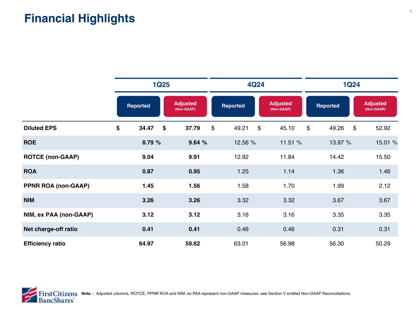 8 1Q25财务业绩-要点虽然NII和NIM在本季度有所下降,但与我们的预期一致。NII和NIM的下降速度较4季度有所放缓。1继续通过回购6.13亿美元A类普通股向股东返还资本,同时保持强劲的CET1比率。6信贷质量保持稳定,NCO比率较上一季度下降5个基点,并在我们的指导区间下限整理。5继续投资于人才、技术和风险基础设施,同时实现我们非利息费用指导的低端。2贷款比上一季度增长11亿美元,增幅为0.8%。增长是由商业银行和SVB商业部门的稳健表现推动的。3存款环比增长41亿美元或2.6%,超出我们的预期,主要受直接银行和普通银行业务增长的推动。4虽然NII如预期在本季度有所下降,但与我们的预期一致。1继续保持强劲的CET1比率,同时在25年第一季度回购了6.13亿美元的A类普通股,使自计划开始以来的回购总额达到24亿美元。7信用质量保持稳定,在投资者依赖、一般办公、设备金融组合中没有出现此前披露的压力点以外的问题。6实现了稳健的非利息收入业绩,这主要是由我们的铁路和商业银行部门推动的。2继续投资于人才、技术和风险基础设施,同时实现我们非利息费用指导的较低端。3受我们所有运营部门增长的推动,存款在上一季度增长41亿美元或2.6%,超出我们的预期。5在我们所有运营部门实现了基础广泛的贷款增长,余额比上一季度增加了11亿美元或0.8%。4