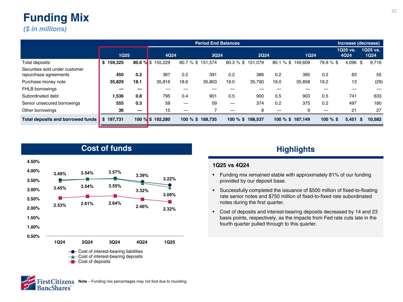 223.49% 3.57% 3.57% 3.39% 3.22% 3.45% 3.54% 3.55% 3.32% 3.09% 2.53% 2.61% 2.64% 2.46% 2.32%计息负债成本计息存款成本1Q24 2Q24 3Q24 4Q24 1Q25 0.50% 1.00% 1.50% 2.00% 2.50% 3.00% 3.50% 4.00% 4.50%资金成本额外流动性来源类别$百万FHLB $ 9,218 FRB 4,203信用额度100总计$ 13,521期末余额增加(减少)1Q25 4Q24 3Q24 2Q24 1Q24 1Q25 vs. 4Q24 1Q25 vs. 1Q24总存款$ 159,32580.6% $ 155,22980.7% $ 151,57480.3% $ 151,079879.9% $ 4,096 $ 9,716根据客户回购协议出售的证券4500.23670.23910.23860.23 950.28 355购买款项票据35,82918.135,81618.635,80319.035,79019.035,85819.213(29)FHLB借款——————————————次级债1,5360.87 950.49 059000.59030.5741633高级无抵押借款5550.358 — 59 — 3740.23 750.24 97180其他借款36 — 15 — 7 — 8 — 9 — 2127存款总额和借入资金$ 197,731 100% $ 192,280100% $ 188,735100% $ 188,537100% $ 187,149100% $ 5,451 $ 10,582 Funding Mix(百万美元)Highlights 1Q25 vs 4Q24 • Funding Mix remains stable with about 81% of our funding provided by our deposit base。•在第一季度成功完成发行5亿美元的固定浮动利率优先票据和7.5亿美元的固定固定利率次级票据。•存款成本和计息存款成本分别下降14和23个基点,因为第四季度末美联储降息的影响持续到本季度。注意–由于四舍五入的原因,资金组合百分比可能不符合要求。待后续草案更新