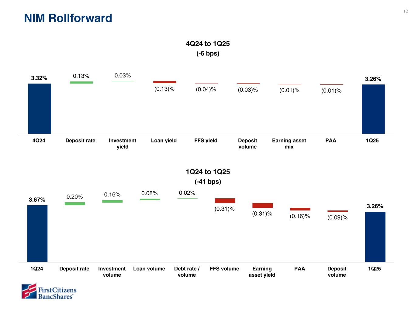 11 $ 1,658 $ 1,681 $ 1,695 $ 1,627 $ 1,588 3.35% 3.36% 3.33% 3.16% 3.12% NII,ex PAA(non-GAAP)NIM,ex PAA(non-GAAP)1Q24 2Q24 3Q24 4Q24 1Q25 $ 1,817 $ 1,821 $ 1,796 $ 1,709 $ 1,6633.67% 3.64% 3.53% 3.26% NII NIM 1Q24 2Q24 4Q24 1Q25 $ 2,441 $ 2,9462.55% 3.14% YTD Dec 21 YTD Dec 22 YTD December vs YTD December 2021 Net interest income increases $ 5.05亿due to a $ 4.83 million increase in interest expense a $ 22 million decre净利息收入的变化主要是由于以下原因:丨由于较高的收益率和增长被较低的SBA-PPP利息和费用收入以及较低的增值收入所抵消,贷款利息收入增加了2.56亿美元;⑤由于较高的收益率和平均余额,投资证券的利息收入增加了1.38亿美元;⑤由于较低的利率和平均余额,借款利息支出减少了1.18亿美元,⑤隔夜投资利息收入增加8900万美元,原因是尽管平均余额较低但收益率较高;部分被更高的利率导致存款利息支出增加9600万美元所抵消。净息差由2.55%扩大至3.14%。5.05亿美元& 59个基点突出显示(4.6)亿美元&(-6个基点)净利息收入和保证金(百万美元)(3.9)亿美元&(-4个基点)由于利息收入减少1.06亿美元,净利息收入减少了4600万美元,部分被利息支出减少6000万美元所抵消。变动的重要组成部分如下:•贷款利息收入(不含PAA)减少8000万美元,主要是由于收益率较低,但被平均余额较高部分抵消;•隔夜投资利息收入减少5700万美元,原因是平均余额和收益率较低;• PAA减少700万美元,•由于平均余额较高,借款利息支出增加400万美元;部分被•存款利息支出减少6400万美元所抵消,原因是支付的利率较低,部分被平均余额较高部分抵消,和•投资证券利息收入增加3700万美元,主要是由于平均余额和收益率较高。净息差由3.32%收缩6个基点至3.26%。NIM,ex PAA收缩4个基点,从3.16%降至3.12%。请参阅以下页面,了解4Q24至1Q25期间的NIM前滚情况。由于利息收入减少1.89亿美元,25年第一季度与24年第一季度相比,净利息收入减少了1.54亿美元,但被利息支出减少3500万美元部分抵消。变化的重要组成部分如下:•由于平均余额和收益率较低,隔夜投资利息收入减少2.03亿美元;• PAA减少8400万美元;•由于收益率较低,贷款利息收入(不含PAA)减少3900万美元,部分被较高的平均余额所抵消;部分被•由于平均余额和收益率较高,投资证券利息收入增加1.32亿美元所抵消;•由于支付的利率较低,存款利息支出减少3500万美元,部分被较高的平均余额所抵消。净息差收缩41个基点,从3.67%降至3.26%。NIM,ex PAA收缩23个基点,从3.35%降至3.12%。请参阅以下页面,了解1Q24至1Q25期间的NIM前滚情况。(1)Non-GAAP衡量:见题为Non-GAAP调节的第五节。(1) (1)
