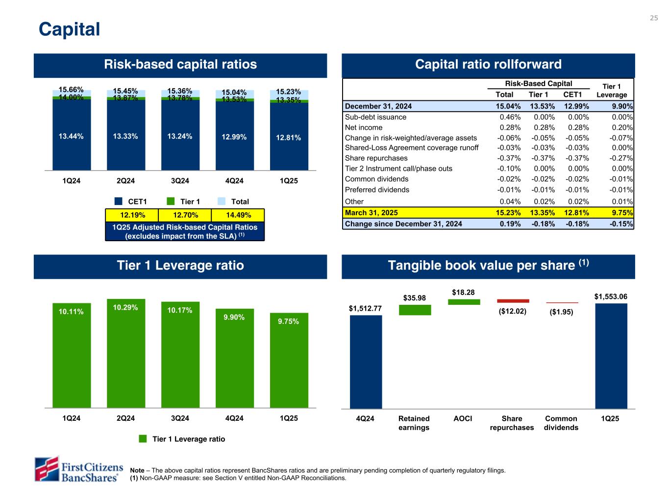 25 10.11% 10.29% 10.17% 9.90% 9.75%一级杠杆率1Q24 2Q24 3Q24 4Q24 1Q25风险资本比率资本比率前滚一级杠杆率每股有形账面价值(1)资本风险资本一级杠杆总额一级CET1月31日,202415.04% 13.53% 12.99% 9.90%次级债发行0.46% 0.000% 0.000%净收益0.28% 0.28% 0.28% 0.20%风险加权/平均资产变动-0.06 %-0.05 %-0.05 %-0.07 %共担损失协议覆盖径流-0.03 %-0.03 %-0.03 % 0.000%股份回购-0.37 %-0.37 %-0.37 %-0.27 %二级工具赎回/淘汰-0.10 % 0.000% 0.000%普通股利-0.02 %-0.02 %-0.02 %-0.01 %优先股息-0.01 %-0.01 %-0.01 %其他0.04% 0.02% 0.02% 0.01% 2025年3月31日15.23% 13.35% 12.81% 9.75%自2024年12月31日以来的变化0.19%-0.18 %-0.18 %-0.15 % 13.44% 13.33% 13.24% 12.99% 12.81% 14.00% 13.87% 13.78% 13.53% 13.35% 15.66% 15.45% 15.36% 15.04% 15.23% CET1 Tier 1 Tier 1 Total 1Q24 2Q24 3Q24 4Q24 1Q25 $ 1,512.77 $ 35.98 $ 18.28($ 12.02)($ 1.95)$ 1,553.06 4Q24留存收益AOCI Share repurchases Common dividends 1Q25 Note – The above capital ratio represents BancShares ratios and are preliminary until completion of quarterly regulatory filings。(1)非公认会计原则计量:见题为非公认会计原则调节的第五节。12.19% 12.70% 14.49% 1Q25调整后基于风险的资本比率(不包括SLA的影响)(1)由于我们继续完成内部验证,资本数据仍在审查中