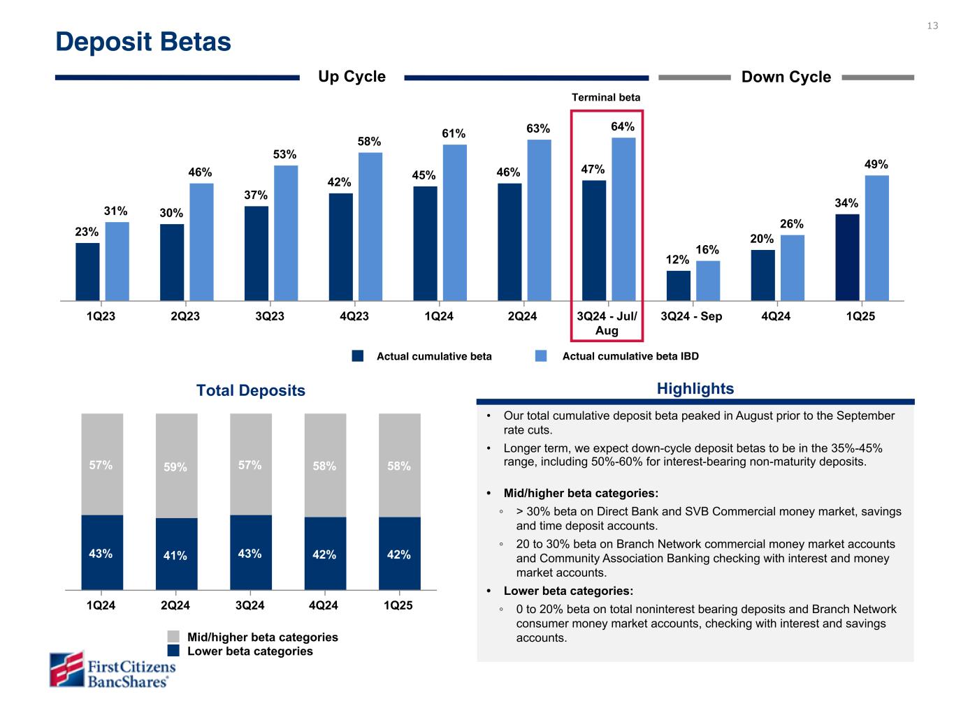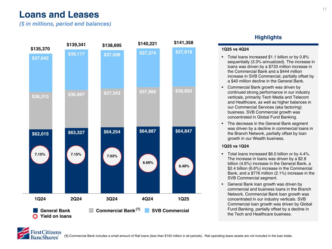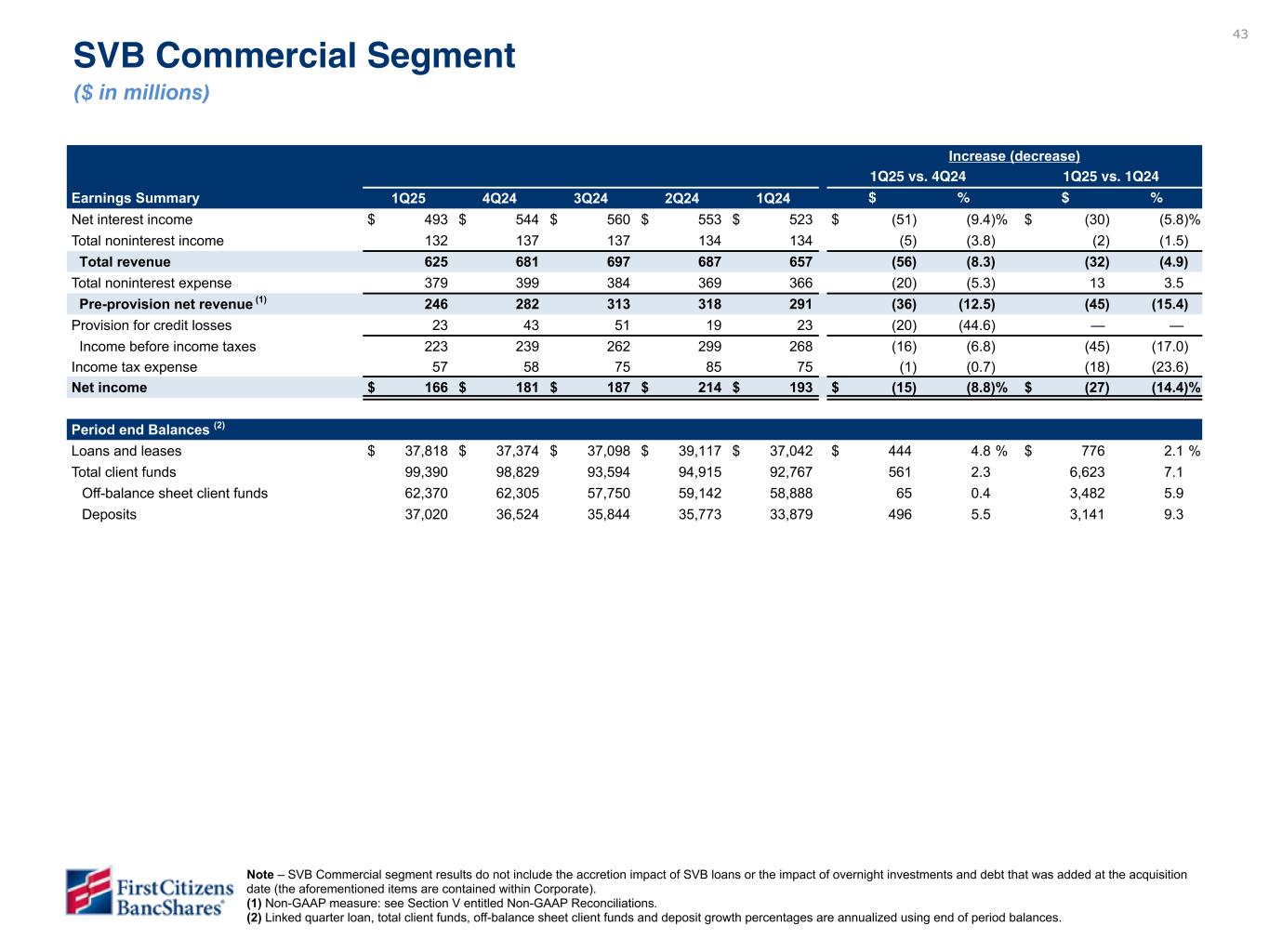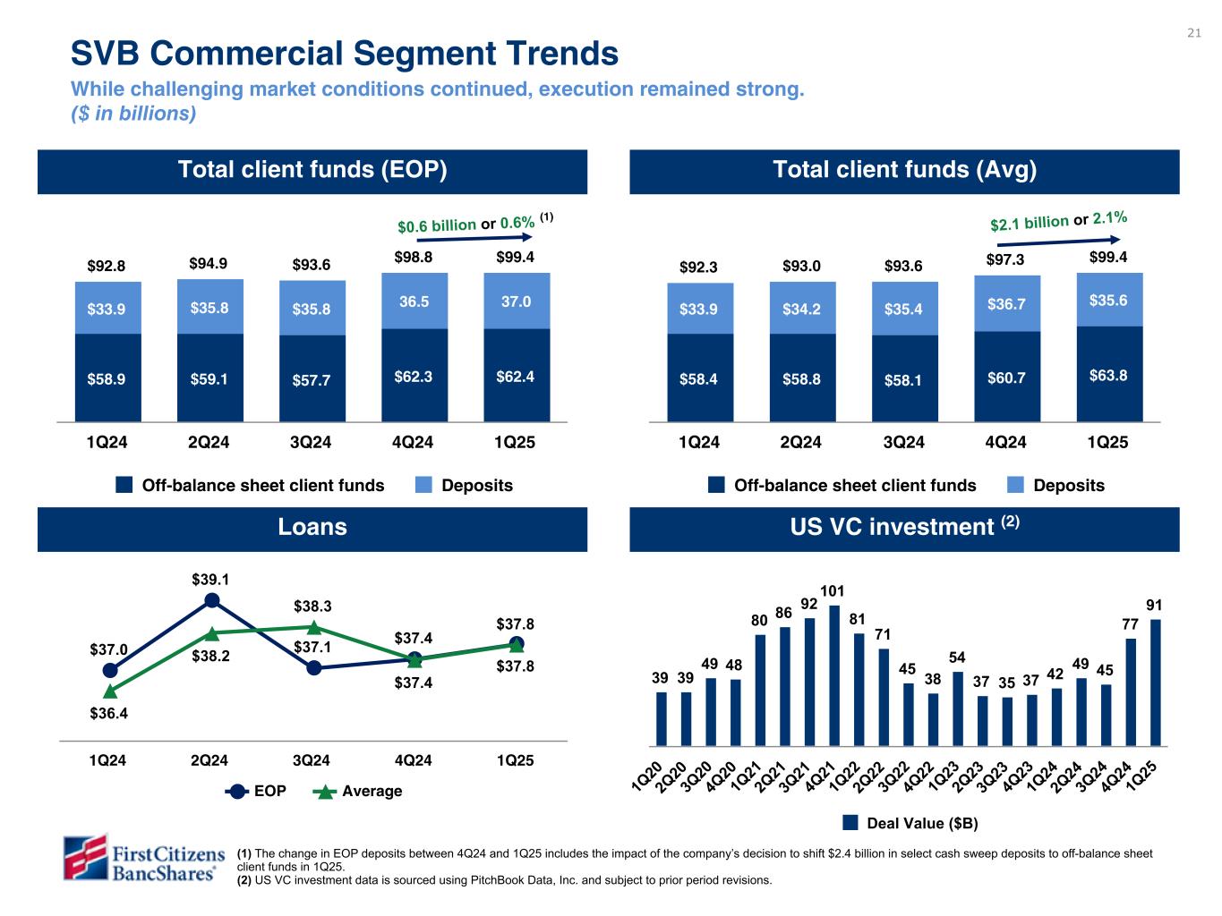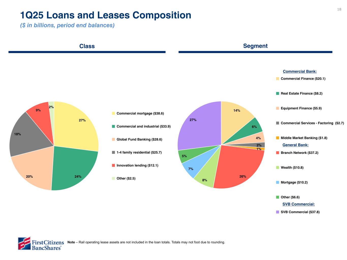 1814% 6% 4% 2% 1% 26% 8% 7% 5% 27%商业金融($ 20.1)房地产金融($ 8.2)设备金融($ 5.9)商业服务-保理($ 2.7)中间市场银行($ 1.8)分支网络($ 37.2)财富($ 10.8)抵押贷款($ 10.2)其他($ 6.6)SVB商业($ 37.8)27% 24% 20% 18% 18% 9% 2%商业抵押贷款($ 38.6)商业和工业($ 33.9)全球基金银行($ 28.6)1-4家庭住宅($ 25.7)创新贷款($ 12.1)其他($ 2.5)类别分部1Q25贷款和租赁构成(十亿美元,期末余额)商业银行:一般银行:SVB商业:注–铁路经营租赁资产不包括在贷款总额中。由于四舍五入的关系,总数可能不够用。