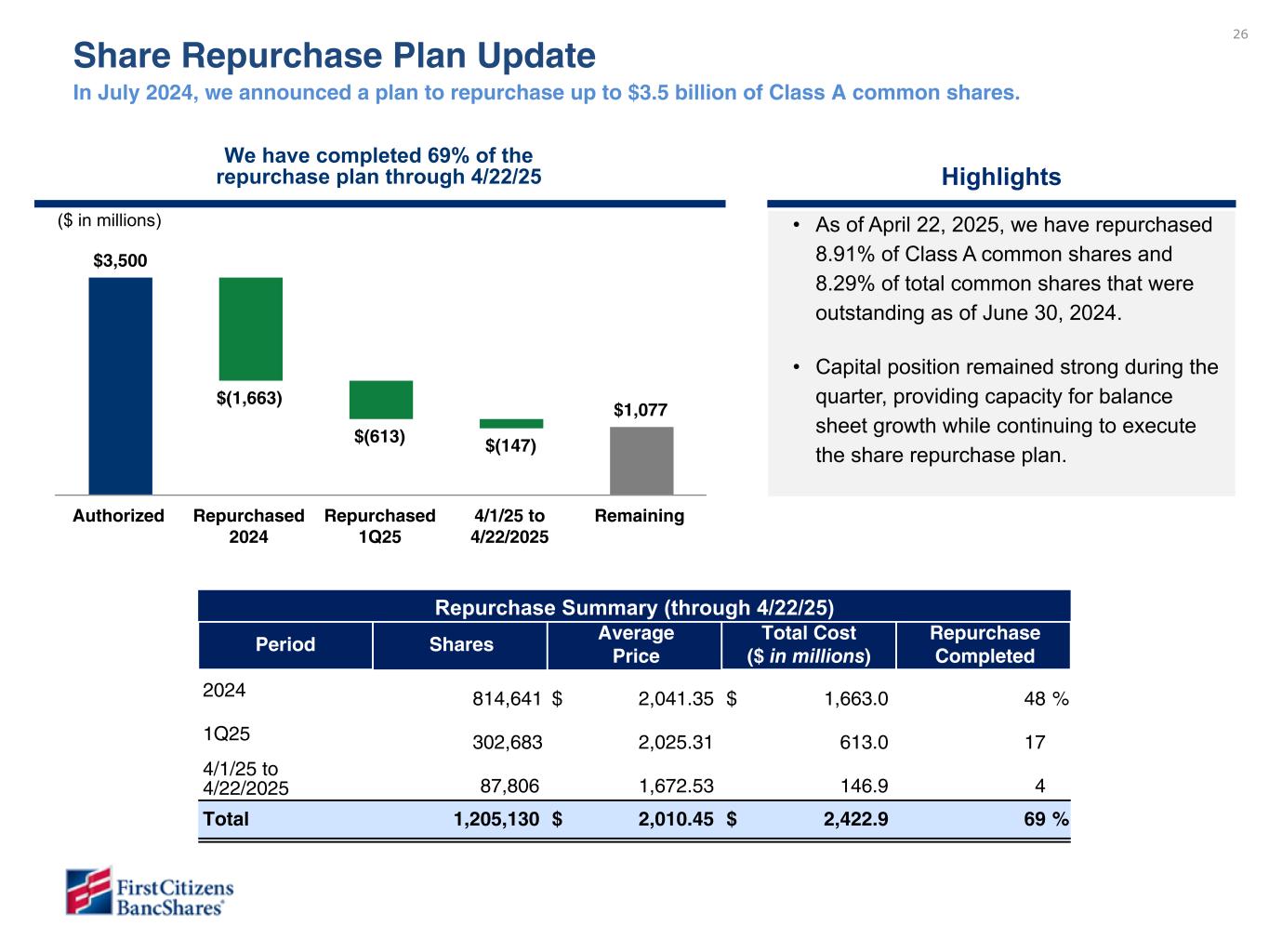 26日股票回购计划更新2024年7月,我们宣布了一项回购高达35亿美元A类普通股的计划。•截至2025年4月22日,我们已回购8.91%的A类普通股,以及截至2024年6月30日已发行普通股总数的8.29%。•本季度资本状况保持强劲,为资产负债表增长提供了能力,同时继续执行股票回购计划。亮点我们已完成69%的回购计划通过4/22/25回购摘要(通过4/22/25)期间股份平均价格总成本(百万美元)回购完成2024814,641 $ 2,041.35 $ 1,663.048% 1Q25 302,6832,025.31613.01 74/1/25至4/22/202587,8061,672.53 146.94总计1,205,130 $ 2,0 10.45 $ 2,422.969% $ 3,500 $(1,663)$(613)$(147)$ 1,077已授权回购2024年已回购1Q25 4/1/25至4/22/2025剩余(百万美元)(1)Non-GAAP衡量标准:见标题为Non-GAAP和解的第五节。•截至2024年11月22日,我们已回购8.91%的A类普通股和8.29%的普通股总数。• 3Q24包括两个月的回购活动,因为我们在7月底董事会批准后开始了回购计划。•尽管有股票回购活动,但我们的调整后CET1比率(1)较关联季度略有增加,因为强劲的盈利和放缓的贷款增长抵消了本季度回购的影响。•迄今为止的平均回购价格为2,0 10.45美元,估计TBV收益大约为3年。待后续草案更新-股份回购计划信息截至1/08/25但将更新至1/21/25崩缩3Q24和4Q24的条形线和行成单一的2024年数据点。数据待更新4/22信息更接近调用