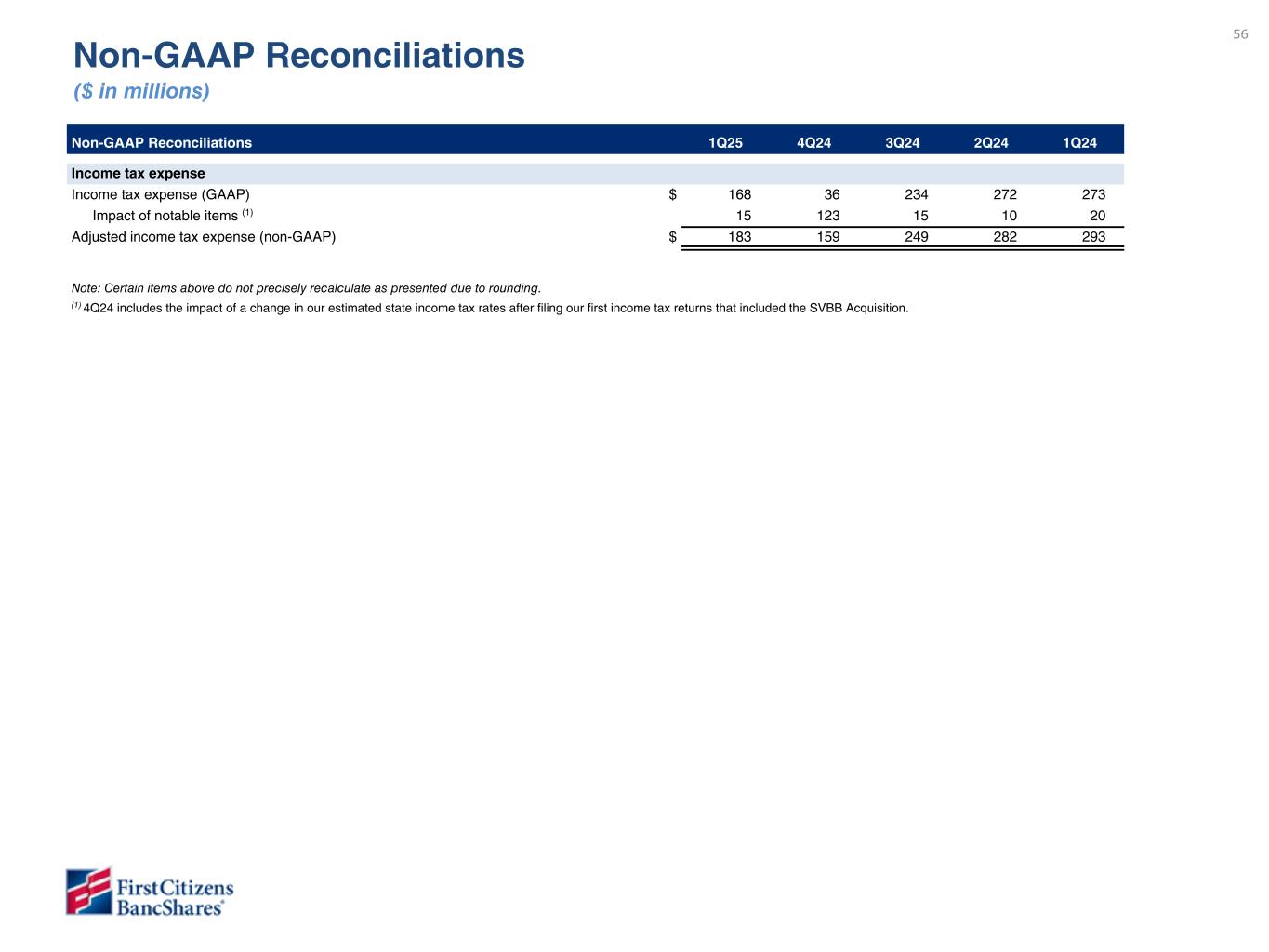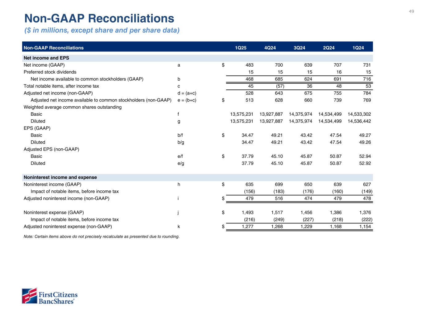 49非GAAP调节1Q25 4Q24 3Q24 2Q24 1Q24净收入和EPS净收入(GAAP)a 483700639707731优先股股息1515151615普通股股东可获得的净收入(GAAP)b 468685624691716值得注意的项目总数,所得税后c 45(57)364853调整后净收入(非公认会计原则)d =(a + c)528643675755784普通股股东可获得的调整后净收入(非公认会计原则)e =(b + c)513628660739769美元加权平均已发行普通股基本f 13,575,23113,927,88714,534,49914,533,302稀释g 13,575,23113,927,88714,375,97414,534,49914,536,442 EPS(GAAP)基本b/f $ 34.47 49.2143.4247.54 49.27稀释b/g 34.47 49.2143.4247.54 49.26调整后EPS(非GAAP)基本e/f $ 37.79 45.10 45.87 50.87 52.94稀释e/g 37。和费用非利息收入(GAAP)H $ 635 699650639627显着项目的影响,所得税前(156)(183)(176)(160)(149)调整后的非利息收入(non-GAAP)i $ 479516474479478非利息费用(GAAP)j $ 1,4931,5171,4561,3861,376显着项目的影响,所得税前(216)(249)(227)(218)(222)调整后的非利息费用(non-GAAP)k $ 1,2771,2681,2291,1681,154注:由于四舍五入的关系,上述某些项目并未准确重新计算。非GAAP对账(百万美元,不包括份额和每股数据)