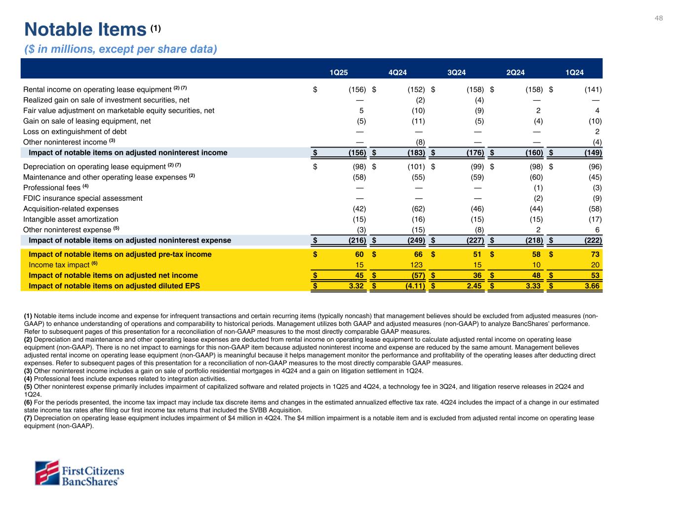 48 1Q23 4Q22 1Q22经营租赁设备租金收入(2)$(156)$(152)$(141)出售可供出售投资证券的已实现收益,净额——(2)—可出售股本证券的公允价值调整,净额5(10)4出售租赁设备的收益,净(5)(11)(10)收购收益——债务清偿收益—— 2其他非利息收入(3)——(8)(4)对调整后非利息收入的影响$(156)$(183)$(149)经营租赁设备折旧(2)$(98)$(101)$(96)维修和其他经营租赁费用(2)(58)(55)(45)工资和福利————收购相关费用(42)(62)(58)无形资产摊销(15)(16)(17)其他非利息费用(4)(3)(15)6对调整后非利息费用的影响$(216)$(249)$(222)CECL第2天计提和未备资金承诺准备金——(716)——信用损失准备金-可供出售的投资证券——(4)——信用损失准备金-调整总额$ —— $ ——对调整后税前收入的影响$ 134 $ 173 $ 38所得税影响(5)(6)1512320对调整后净收入的影响$ 45 $(57)$ 53对调整后摊薄每股收益的影响$ 3.32 $(4.11)3.66值得注意的项目(1)(百万美元,每股数据除外)1Q25 4Q24 3Q24 2Q24 1Q24经营租赁设备租金收入(2)(7)$(156)$(152)$(158)$(158)$(141)出售投资证券的已实现收益,净额——(2)(4)——可出售股本证券的公允价值调整,净额5(10)(9)24出售租赁设备的收益,净额(5)(11)(5)(4)(10)债务清偿损失———— 2其他非利息收入(3)——(8)——(4)显著项目对调整后非利息收入的影响$(156)$(183)$(176)$(160)$(149)经营租赁设备折旧(2)(7)$(98)$(101)$(99)$(98)$(96)维修及其他经营租赁费用(2)(58)(55)(59)(60)(45)专业费用(4)————(1)(3)FDIC保险特别评估————(2)(9)购置相关费用(42)(62)(46)(44)(58)无形资产摊销(15)(16)(15)(15)(17)其他非利息费用(5)(3)(15)(8)26显著项目对调整后非利息费用的影响$(216)$(249)$(227)$(218)$(222)显著项目对调整后税前收入的影响$ 60 $ 66 $ 51 $ 58 $ 73所得税影响(6)15123151020显著影响调整后净收入项目$ 45 $(57)$ 36 $ 48 $ 53值得注意的项目对调整后稀释后每股收益的影响$ 3.32 $(4.11)$ 2.45 $ 3.33 $ 3.66(1)值得注意的项目包括不经常交易的收入和支出以及管理层认为应从调整措施(非公认会计原则)中排除的某些经常性项目(通常是非现金),以增强对运营的理解以及与历史时期的可比性。管理层利用GAAP和调整后的指标(非GAAP)来分析BancShares的业绩。有关非GAAP措施与最直接可比的GAAP措施的对账,请参阅本演示文稿的后续页面。(2)折旧和维护以及其他经营租赁费用从经营租赁设备的租金收入中扣除,以计算调整后的经营租赁设备的租金收入(非公认会计准则)。由于调整后的非利息收入和支出减少了相同的金额,因此这一非公认会计原则项目的收益没有净影响。管理层认为,调整后的经营租赁设备租金收入(非美国通用会计准则)是有意义的,因为它有助于管理层监控扣除直接费用后的经营租赁的业绩和盈利能力。有关非GAAP措施与最直接可比的GAAP措施的对账,请参阅本演示文稿的后续页面。(3)其他非利息收入包括24年第四季度出售投资组合住宅抵押贷款的收益和24年第一季度的诉讼和解收益。(4)专业费用包括与融合活动有关的费用。(5)其他非利息费用主要包括1Q25和4Q24资本化软件及相关项目减值、3Q24技术费、2Q24和1Q24诉讼准备金释放。(6)对于列报的期间,所得税影响可能包括税收离散项目和估计年化有效税率的变化。Q4 24包括我们在提交包含SVBB收购的第一份所得税申报表后,我们估计的州所得税税率发生变化的影响。(7)经营租赁设备折旧包括4Q24的400万美元减值。400万美元的减值是一个值得注意的项目,不包括在调整后的经营租赁设备租金收入(非美国通用会计准则)中。
