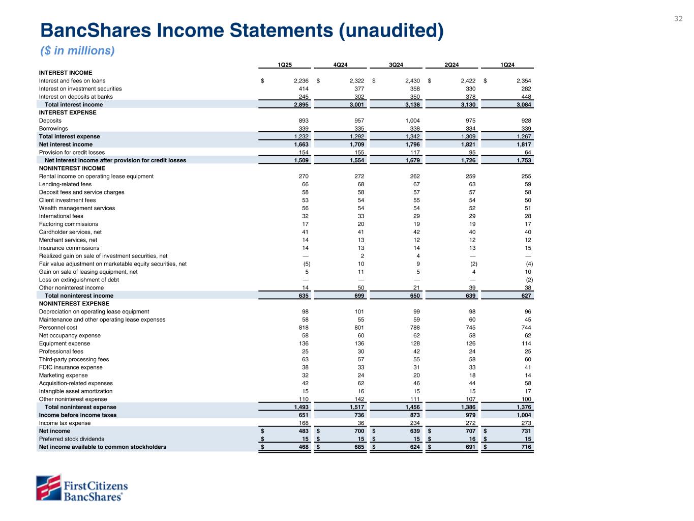 32 1Q25 4Q24 3Q24 2Q24 1Q24利息收入利息贷款及费用$ 2,236 $ 2,322 $ 2,430 $ 2,422 $ 2,354投资证券利息414377358330282银行存款利息245302350378448总利息收入2,8953,0013,1383,1303,084利息费用存款8939571,004975928借款339335338334339总利息支出1,2321,2921,3421,817净利息收入1,6631,7091,7961,8211,817信贷损失准备1541551179564拨备后净利息收入信用损失1,5091,5541,6791,7261,753非利息收入经营租赁设备租金收入270272262259255借贷相关费用6668676359存款费和服务费5858575758客户投资费5354555450财富管理服务5654545251国际费用3233292928保理佣金1720191917持卡人服务净额4141424040商户服务净额1413121212保险佣金1413141315出售投资证券实现收益,净额— 24 ——可出售股本证券的公允价值调整,净额(5)109(2)(4)租赁设备销售收益,净额5115410债务清偿损失————(2)其他非利息收入1450213938非利息收入总额635699650639627非利息费用经营租赁设备折旧98 101999896维修及其他经营租赁费用5855596045人员费用818801788745744净占用费用5860625862设备费用136136128126114专业费用2530422425第三方处理费6357555860 FDIC保险费用3833313341营销费用3224201814收购相关费用4262464458无形资产摊销1516151517其他非利息费用110142111107100非利息费用总额1,4931,5171,4561,3861,376收入所得税前6517368739791,004所得税费用16836234272273净收入483美元700美元639美元707美元731美元优先股股息15美元15美元15美元16美元15美元普通股股东可获得的净收入468美元685美元624美元691美元716美元BancShares损益表(未经审计)(百万美元)