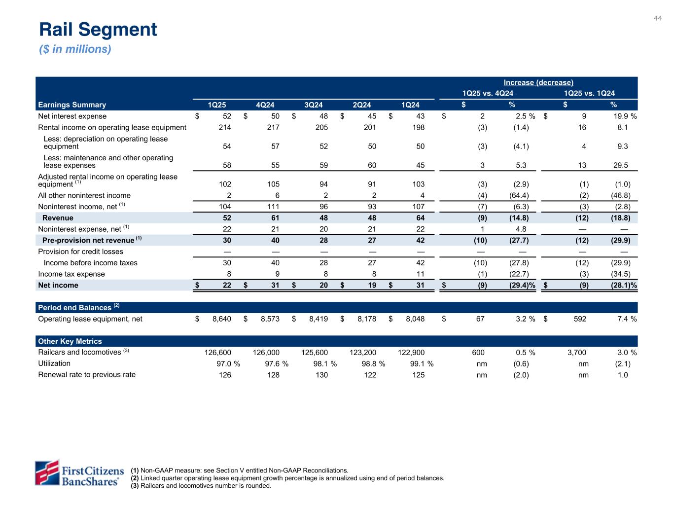 44增加(减少)25年第一季度对比24年第四季度25年第一季度收益摘要25年第一季度对比24年第三季度对比24年第一季度对比22年第一季度对比22年第一季度对比22年第一季度对比22年第一季度对比22年第四季度对比22年第四季度对比22年第四季度对比22年第四季度对比22年第四季度对比22年第四季度对比22年第四季度对比22年第四季度对比22年第四季度对比22年第四季度对比22年第四季度对比22年第四季度对比22年第四季度对比22年第一季度对比22年第四季度对比22年第四季度对比22年第四季度对比22年第四季度对比22年第四季度对比22年第四季度对比22年第四季度对比22年第四季度对比22年第四季度对比22年第四季度对比22年第四季度对比22年第四季度对比22年第四季度对比22年第四季度对比2及其他经营租赁开支585559604535.3 1329.5经调整经营租赁设备租金收入(1)1021059491103(3)(2.9)(1)(1.0)所有其他非利息收入26224(4)(64.4)(2)(46.8)非利息收入净额(1)1041119693107(7)(6.3)(3)(2.8)收入5261484864(9)(14.8)(12)(18.8)非利息开支,净额(1)222120212214.8 ——拨备前净收入(1)3040282742(10)(27.7)(12)(29.9)信用损失准备——————————所得税前收入3040282742(10)(27.8)(12)(29.9)所得税费用898811(1)(22.7)(3)(34.5)净收入$ 22 $ 31 $ 20 $ 19 $ 31 $(9)(29.4)% $(9)(28.1)%期末余额(2)经营租赁设备,净额8,640美元8,573美元8,419美元8,178美元8,048美元673.2% 5927.4%其他关键指标轨道车和机车(3)126,600126,000125,600123,200122,9006000.5% 3,7003.0%利用率97.0% 97.6% 98.1% 98.8% 98.8% 99.1% nm(0.6)nm(2.1)续订率与先前比率126128130122125 nm(2.0)nm 1.0轨道段(百万美元)(1)Non-GAAP衡量:见题为Non-GAAP和解的第V节。(2)挂钩季度经营租赁设备增长百分比使用期末余额进行年化。(三)轨道车、机车车号四舍五入。亮点•机队有效充分利用,利用率达97.0%。•有利的更新重定价趋势持续,较本季度到期率增长28%,货车(+ 36%)和罐车(+ 21%)均有增长。•经营租赁设备的调整后租金收入较上一季度有所增加,反映出车队增长、持续的积极重新定价趋势和较低的维护费用。数据尚未得到验证。待后续草案定稿。正在更新的格式,以更好地与新的SEC分部披露保持一致。